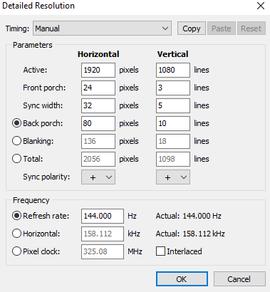 (04-13-2023 12:41 AM)ToastyX Wrote:Thanks for info, I now have a better understanding of the tool usage and i see all the monitor modes in the second screen indeed(04-12-2023 09:53 AM)endao2 Wrote: It shows 60 hz instead of 144 Hz. I added 3 images with what i see. This is wrong, do i have some wrong settings or what is going on, can you help me understand this. I did not edit anything yet its the first time i opened the utility and it displays this info. The monitor is reporting 144 Hz though to be honest something seems off, playing at 60-100 Hz looks so bad it seems like 30 and bellow. Wondering if I didnt mess up something some time ago and the monitor got stuck with some wrong settingsI don't see a problem. Your screenshots show 144 Hz is in the extension block, and you even highlighted it. If you're using a refresh rate supported by the monitor, then any performance issue is usually on the GPU's end, not the monitor. If I may ask a different question. I have the GPU memory locked at max freq (2000Mhz in my case) and also dealing with some input lag (some gpu drivers way worse than others) and I am thinking to use another mode to see if GPU memory will go down I found that some people fixed this using a different timing. Is there a risk running pixel clock at 346 vs the max reported(330 in my case)? I attached what it looks like if i chose that timing. Am I understanding correctly that the monitor is being instructed by the OS on how to operate by altering the registry? Or its a gpu driver change as well? Also would this have an impact of how fast the image is being displayed right? Could this add / remove some perceived input lag? I'm troubleshooting Rocket League and its a very fast paced game If this would fix the gpu memory issue with no impact in games it would be nice |