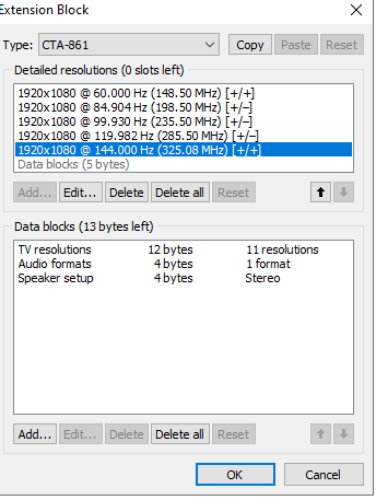 (04-12-2023 09:53 AM)endao2 Wrote: It shows 60 hz instead of 144 Hz. I added 3 images with what i see. This is wrong, do i have some wrong settings or what is going on, can you help me understand this. I did not edit anything yet its the first time i opened the utility and it displays this info. The monitor is reporting 144 Hz though to be honest something seems off, playing at 60-100 Hz looks so bad it seems like 30 and bellow. Wondering if I didnt mess up something some time ago and the monitor got stuck with some wrong settingsI don't see a problem. Your screenshots show 144 Hz is in the extension block, and you even highlighted it. If you're using a refresh rate supported by the monitor, then any performance issue is usually on the GPU's end, not the monitor. (04-12-2023 09:53 AM)endao2 Wrote: Also can i delete those? Why are there so many entries, are they from old plug and play actions that were saved in registry or something?Every connection to every port and even different drivers can cause a new entry to appear. You can remove all of them. Active entries are automatically recreated after rebooting or running restart.exe. Running reset-all.exe and rebooting will remove everything and reset the active entries. Running restart.exe can have the side effect of creating a second entry because of the basic display driver, but that isn't used. |