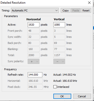 (04-13-2023 12:41 AM)ToastyX Wrote:Thanks for info, I now have a better understanding of the tool usage and i see all the monitor modes in the second screen indeed(04-12-2023 09:53 AM)endao2 Wrote: It shows 60 hz instead of 144 Hz. I added 3 images with what i see. This is wrong, do i have some wrong settings or what is going on, can you help me understand this. I did not edit anything yet its the first time i opened the utility and it displays this info. The monitor is reporting 144 Hz though to be honest something seems off, playing at 60-100 Hz looks so bad it seems like 30 and bellow. Wondering if I didnt mess up something some time ago and the monitor got stuck with some wrong settingsI don't see a problem. Your screenshots show 144 Hz is in the extension block, and you even highlighted it. If you're using a refresh rate supported by the monitor, then any performance issue is usually on the GPU's end, not the monitor. If I may ask a different question. I have the GPU memory locked at max freq (2000Mhz in my case) and also dealing with some input lag (some gpu drivers way worse than others) and I am thinking to use another mode to see if GPU memory will go down I found that some people fixed this using a different timing. Is there a risk running pixel clock at 346 vs the max reported(330 in my case)? I attached what it looks like if i chose that timing. Am I understanding correctly that the monitor is being instructed by the OS on how to operate by altering the registry? Or its a gpu driver change as well? Also would this have an impact of how fast the image is being displayed right? Could this add / remove some perceived input lag? I'm troubleshooting Rocket League and its a very fast paced game If this would fix the gpu memory issue with no impact in games it would be nice |
