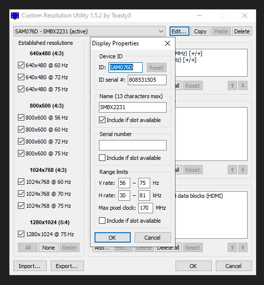 I recently discovered CRU and have been using it to create custom resolutions for myself. They've always worked within the normal range for me. I basically use the program to create native 60hz resolutions and then create a custom 77hz resolution through AMD Radeon Software (it's safer to do it that way in my head). I created many of them (1440x1080, 1600x1024, 1280x1080), all with 77hz (maximum my monitor supports, above that it has no video response). But recently I've preferred 1920x1080 since my game (Valorant) doesn't have in-game differences between 4:3 and 16:9 and I ended up finding it a problem. At 1920x1080 the maximum I can put is 73hz. I was curious and went to try to understand why. I read the whole document and understood that the reason for this is probably the "max pixel clock" which in my case is 170MHz (as in the image). But the doubt came to me, shouldn't my limit be 300MHz? I have an RX 570 (which has an HDMI 2.0b output) and an HDMI 2.0 cable as well. Shouldn't it have a higher pixel clock number? Or does this parameter depend on the monitor? |