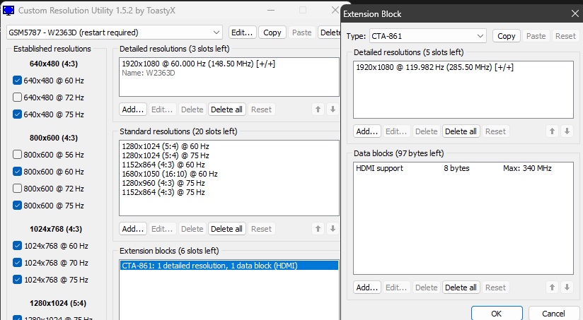 You need dual-link DVI to get 120 Hz. HDMI-DVI adapters/cables are always single-link. There's no way to convert HDMI to dual-link DVI. Adding an HDMI data block in the extension block will make the GPU send an HDMI signal, which should allow you to select 120 Hz, but the monitor might not accept a single-link signal on the DVI port. You'll have to try it and see. Some monitors will display it with a warning message, but some monitors won't let you dismiss the warning message. [/quote] Thank you so much! And how i go about it? pLEASE I have this options EDIT: I GOT UP TO THIS POINT EDIT 2: Got it to work! here are the details! Thanks so much w/o changing the extension block wouldnt ve worked! How do one donates? USDT? THANKS!! |