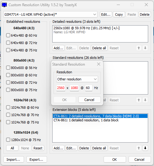 I'm having trouble with my LG monitor resolution since august 24th. The best fit resolution (2560x1080) is not available, I've tried everything from updating drivers to formatting Windows. Using CRU, I can't write the desired values when adding a new standard resolution. I've tried using extension blocks such as CTA-861 (TV resolutions) but still can't add the resolution I need. I'm using HDMI with no adapter. Tried HMDI 2.0 as well. Can someone please help? I think I'm using the wrong extension block or in the wrong way. I'm using a Dell 11th Gen Intel® Core i7-1165G7 @ 2.80GHz 2.80 GHz (Windows 11) with NVIDIA GeForce MX330 and Intel Iris Xe Graphics. My monitor is a LG 29LW500-B. Thanks! |