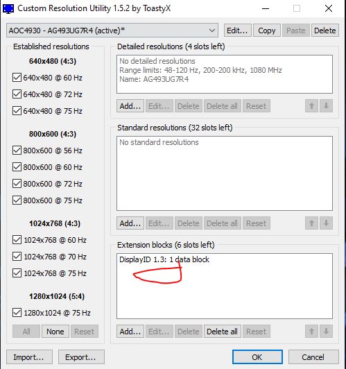 (09-29-2023 03:34 PM)ToastyX Wrote:(09-29-2023 02:45 PM)Dinkles Wrote: Ahh that’s a shame, why would they build the monitor this way, it’s a new monitor with modern standards (connectors/aspect etc) why would they allow it to register the wrong native res?Delete all detailed, standard, established resolutions in the main window. In the CTA-861 extension block, delete all detailed resolutions and the TV resolutions data block. That should leave you with only the resolutions in the DisplayID 1.3 extension block. So i think i have done it correctly... There was an extension of sorts in the bottom block, but i may have deleted the entire thing, i cant remember? I think it was a CTA-861 extension block but its gone now after i removed some data? However, it still seems to have worked as the monitor now registers 5120 as its recommended res (as per screenshot) and NIS now shows BLUE which means i can use scaling/sharpening again! Fantastic! However, should i reinstall the monitor, do it again and be more careful, as i may have removed something important from that data block in the extension block or is it all good? Hopefully you can get 2.0 out with features to fix issues such as these for others, profiles etc for specific monitors etc. as this is a massive fix for me, it essentially fixes all scaling NIS/DLSS etc for me AND stops the monitor resetting every time i switch it off/on or disable and re enable it. Massive help and honestly allows me to use features i was previously unable to use again! Also the monitor has an option to enable or disable DDC/CI is this of any relevance in this scenario? Cheers Toasty |