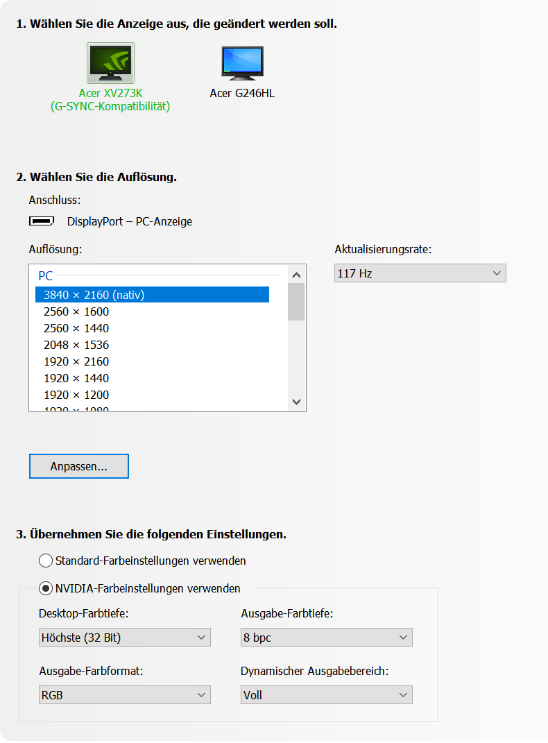 I have the Acer XV273K monitor (4K, 120Hz(-144Hz with Dual DP), Ports: 2 x DisplayPort 1.4 & 2 x HDMI 2.0) (https://www.displayspecifications.com/de/model/407f14c5) and a RTX 3080 (Ports: 3 x DisplayPort 1.4a & 2 x HDMI 2.1). I have had some issues with Black Screens and Alt-Tabbing for a while. For example, I would Alt-Tab out of GTA V and the screen would go black for a few seconds as if the resolution or refresh rate were being changed. But nothing was changed and it annoyed me. Then I stumbled upon this Reddit post (https://www.reddit.com/r/OLED_Gaming/com...lttabbing/) where a guy describes my problem and says it's because of DSC. After that, I got into a 4-hour rabbit hole of CRU, and now I know a lot more about it than I would like to. My issue now: In CRU if I add a DisplayID 1.3 extension block and add a Detailed Resolution of 3840x2160 with "CVT-RB standard" selected I can use 120Hz and even more with no problems. To avoid DSC, I need to use a refresh rate under 118.2Hz and use 8 bpc and RGB (as per calculator: https://linustechtips.com/topic/729232-g...mulas=show) as the monitor only has DP 1.4 and the RTX 3080 only supports DP 1.4a. Altough another site says max. 116.8Hz. (https://tomverbeure.github.io/video_timings_calculator) This also works (although between ~117.8Hz and 119Hz I get some weird jittering of the whole screen, so I just use 116.700Hz). If I select "CVT-RB2 standard" I should be able to go as high as 120.4Hz, (calculator: https://linustechtips.com/topic/729232-g...mulas=show) but I can't. If I use CVT-RB2, the screen goes crazy with artifacts and green colors and flickering as if he doesn't recognize the signal or something. This only happens with < ~60Hz and sometimes up to ~80Hz, and sometimes I can only go up to 30Hz. It's random? I already tried two different 1.4 DP cables (PI5010-020 & BN39-01879N) and recalculated the values that would be needed for CVT-RB2 (https://tomverbeure.github.io/video_timings_calculator) but they were always correct. I never use the Dual DP mode in the OSD of the monitor for 144Hz as it activates some input lag. In OSD, the DP Format is set to 1.4, HDMI Black Level on Normal, FreeSync on On, HDR on Off, 4K-144Hz Mode on Off, Wide Mode on Aspect, Color Space on Standard. Do some monitors just not support CVT-RB2? Or do I have some other settings wrong? |