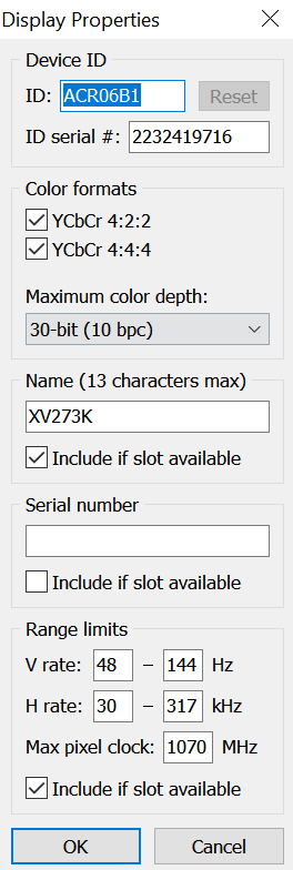 To do this , we'll all my resolutions were the 3440x1440 ones , so I simply changed them all to 2560x1440 and didn't touch anything else. It appeared to work, however when selecting any hz besides 60 or 120 I get a black screen. My options are 60 100 120 144 175 For reference, I can use other hz such as my native 175 on 2560x1440 when choosing it in the nvcp when I don't make changes by removing the 3440x1440 ones with cru, or rather changing them to 2560x1440 ones would be more exact. So something about 2560x1440 now being my native resolution caused this maybe? I tried going back into cru and tried different timings such as exact reduced, yet sadly to no avail. I'm extremely fresh to this all so excuse my ignorance. Could I please get some assistance? It would be very appreciated For reference I'm trying to use a 175hz, which is my monitors native max. And considering g sync exists , I haven't the need to play at anything lesser. So as long as I can get that working that's plenty for me! Aw3423dw. Newest GeForce driver, let me know if there's any other information I should provide. Thanks in advance! Edits for new information: turns out any of my other resolutions in the nvcp , such as 1920x1080 , don't work at 175hz either. Deleting every other displayId resolution besides the 175hz one didn't work Deleting all extensionblock resolutions besides the 175hz one hasn't either. Rebooting my pc hasn't worked. When changing the display ID from 1.3 to 2.0 the 175hz option dissapears from nvcp (its the only resolution left as i deleted the rest, minus the default 60hz one ofc) And when having both a display ID 1.3 and 2.0 175hz resolution, I do see the option to choose it again, yet I black screen. |