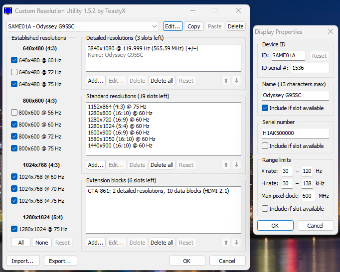 I've been reading in these forums and reddit about solving screen brightness flickering because of VRR, so all i want to do is to change the Variable Refresh Rate range but i can't figure out how to do it. I have an Odyssey G9 OLED that i'm always using at 5120x1440 at 240hz. I thought all i had to do is press the "edit" button and change the V value but the values are empty, or they have lower hertz values than my current refresh rate in use, and my monitor is also displayed many times in the dropdown menu. So basically, if i press Edit on my active monitor i don't know what to write down in the V-rate, H-rate and Max pixel clock values because they're empty and i don't know how to know the proper values for those. I wanted to try something like 120-240hz as my VRR range. I attached pictures of the "6 odyssey monitors" that i have there and their properties. Thank you so much in advance to anybody who could help me! |
