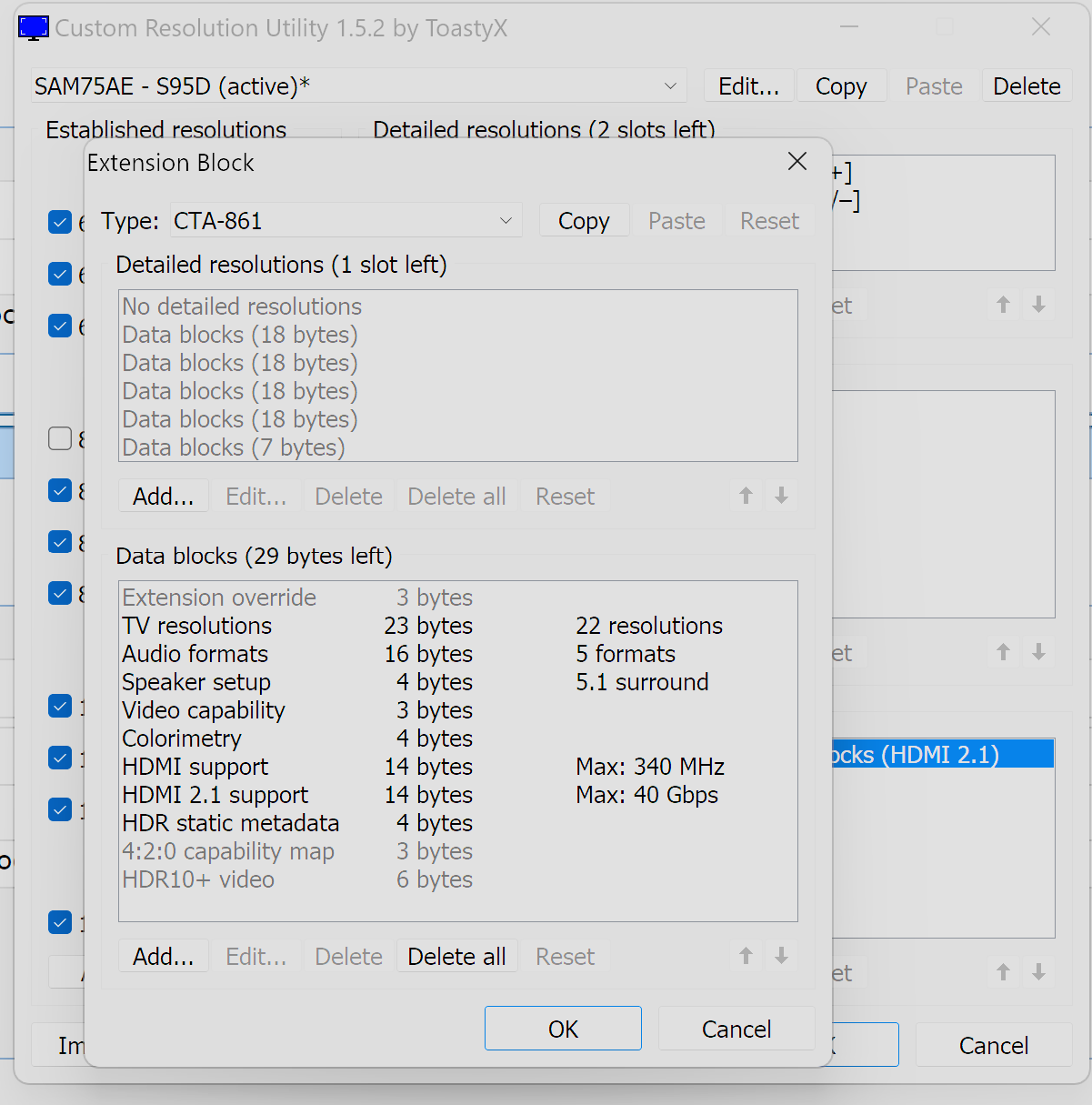 I always use CRU to remove the 4096x2106 resolution from my TV's, as I find it can cause issues when launching some games for the first time on my PC. I've just upgraded for a Samsung S95B QDOLED to a Samsung S95D QDOLED and I am finding that my regular CRU fix methodology is not working. Games are still showing the 4096 resolution, as is NVCP?? Steps followed are editing the CTA-861 Extensions Block as follows: 1 Remove all 4096x2160 resolutions from 'TV RESOLUTIONS' (there were 6x) 2. Remove all 4096x2160 resolutions from 'HDMI SUPPORT' (there was 1x) Looking at the how to (and some earlier posts here), there is reference to removing the resolution from the '4.2.0' Block also. Whilst I've never had to do this before, happy to do so, however the only block I have with a similar naming convention is '4.2.0 CAPABILITY MAP', but that is greyed out? Have tried multiple reboots, restarts and resets, but that pesky resolution remains available in Windows 11 for some reason!? Have added a screenshot below... would appreciate any advice. Thanks ![]() |