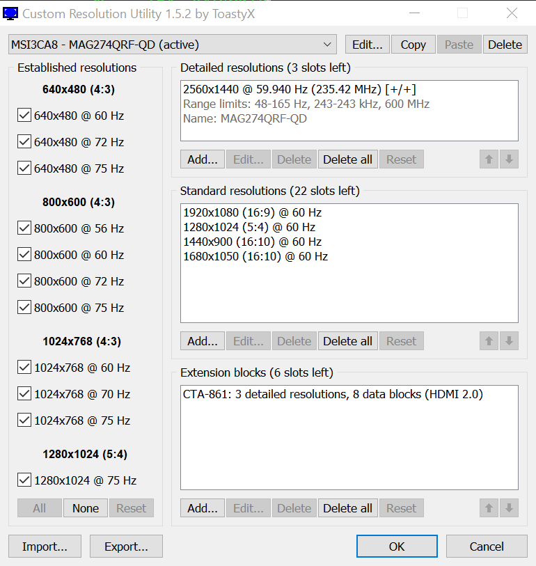 Modified VRR range from 48-240 to 85-240 in both "Range Limits" and "FreeSync range" because I'm trying to mitigate as much VRR flickering as I can using LFC. When I game at 60-80fps+ and it shows VRR working with the refresh rate at 120Hz+ and such after using restart64.exe, but the issue is after I restart my entire PC and suddenly the VRR range is messed up and doesn't activate LFC at 60-80fps+ unless I limit the game to 57 fps or below (CRU still shows the modified VRR ranges at 85-240). Have to use reset-all.exe and re-configure the VRR range again. For the record, this seems to be an issue when using HDMI 2.1 on my end. When I use DisplayPort, the modified VRR range works as intended even after restarting my PC. The reason why I'm not using DisplayPort is to avoid relying on DSC for 1440p 240Hz (and using HDR). |