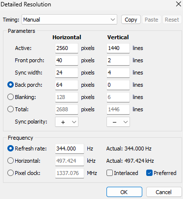 You were supposed to start from CVT-RB2 base in CRU and then reduce H Blank to 80, V Front porch 7 or so, V Blank 55 or so. use CVT-v2.0-Generator-Version-1.xlsx can be imported in google sheets after downloading it if not having office Code: --- Under PARAMETER VALUES modify: or CTA-861-OVT-Calculator Code: --- Under Algorithm Parameter Values, click Modify: CVT-RB3 vs CTA-OVT is mostly swapped sizes for V Front porch and V Back porch, so could jiggle a bit with it, but other than that it's pretty much take-it or leave-it |