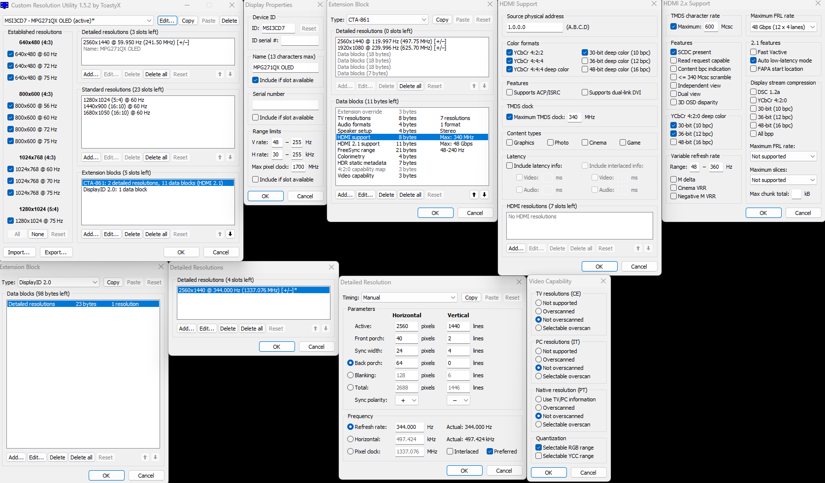Firstly this firmware finally came out for MSI 271QRX: So DSC can be toggled off now, and it has a full fledged 48gbps HDMI 2.1 port, along with a certified cable it comes with. Now there are calculators such as the LTT one and this: https://tomverbeure.github.io/video_timings_calculator Which show with custom timings 360Hz 2560x1440 10bit should be possible without DSC: Etc. However no matter what I do I'm unable to get 350Hz or anything higher stable, I can get 350Hz to show up in NVCP but applying it results in a mess. Now what's extra weird is this extends to 8bit, which according to those calculators can have enough bandwidth for 460Hz at 2560x1440 (not that I expect the panel to do that), so surely it isn't a bandwidth limitation. It also hits a wall at around 345Hz just like 10bit, not being able to do 350Hz or higher when it should easily be able to do the 360Hz or at least more than 10bit can if it was a bandwidth limitation. So what is going on? What's limiting me? This is what I'm currently running: I tried digging around CRU to see if there was some limit I could delete/override that was stopping both 10bit and 8bit at 350Hz, but no luck. Also 350Hz seems to only like to appear once you're just under 1340Mhz pixel clock, not that it's stable. Hblank starts falling apart around 100, I don't really have more room/stability to save on pixel clock much anywhere. Any idea what the limitation is? When 8bit 2560x1440 is hitting a wall at the same place as 10bit 2560x1440 when if it was a bandwidth limitation 8bit should be able to achieve some degree higher refresh rate but it's stopped by something at the same place. I even disabled 10bit support in CRU and 8bit still couldn't go any higher. Thanks Lastly here's basically everything exposed by CRU: |