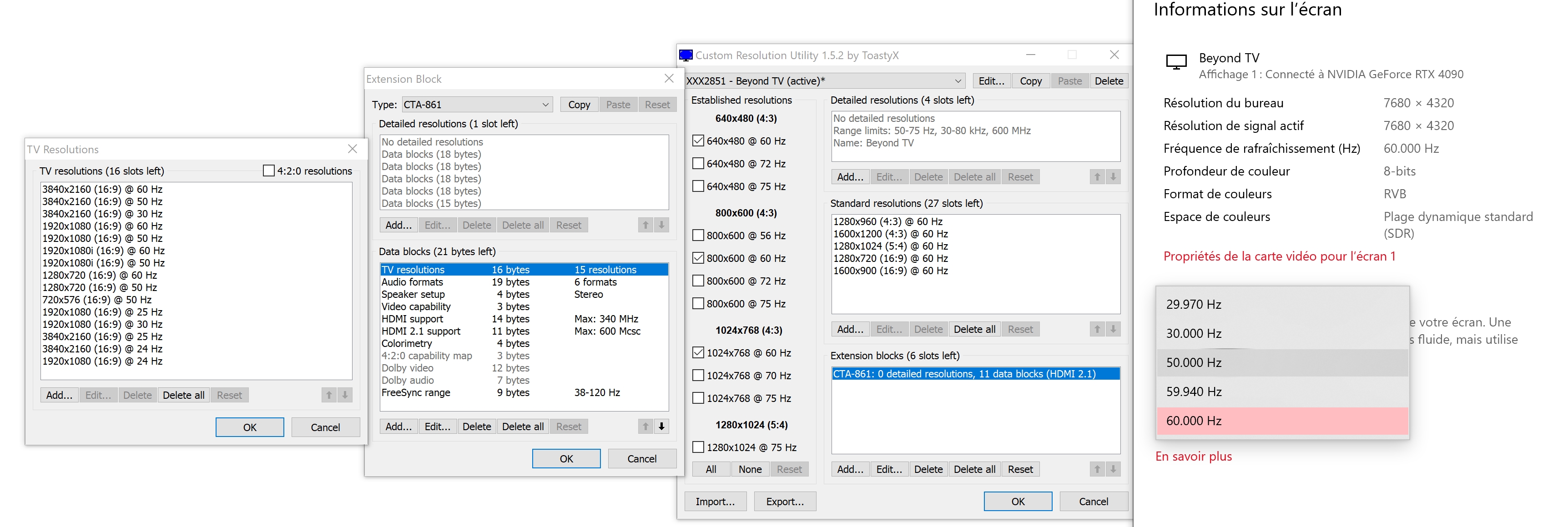 i play on TV ( TCL 55C635 4k ) with my big PC windows 10 RTX4090 and all works fine. but i upgrade my TV to a TCL 65X925 8k but on CRU i can't apply any change and by default it's not show me 8k resolution of the new TV, i think CRU show me settings of my old TV TCL ? if anyone kown how to solve this ? i want to create custom refresh rate like (40hz 45hz 35hz) see screenshot if it work sorry for my bad english i'm french |