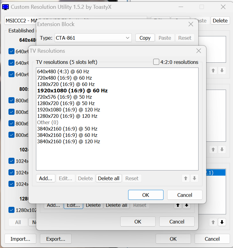 Because deleting TV resolutions etc just gives me a blackscreen/no signal and the system locks up. In only of the extension blocks it does list 4K 160hz but not sure how that can be accessed. HDR only works on 60hz as well. Please let me know if I need to put any additional details. |
