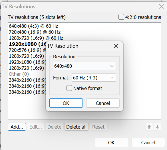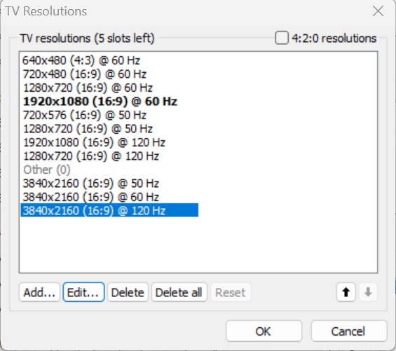 (09-07-2024 07:53 PM)Dump777 Wrote: ok so i added 2560 x 1440 with 144hz again manually (its already there in displayID) and now i do see pop up in nvidia control panel too but 2560 x1440 @ 160hz gave me a black screen (maybe its because of the HDR thing which i am not sure how to specifiy it should be at 4:2:2 or whatever the case) trying to see now if i can re-add 3840 x 2160 @144 hz and see if it appears)You should also ask Acer because the limitation is coming from the laptop. You can turn off HDR in the Windows display settings. It's possible the monitor won't accept 2560x1440 @ 160 Hz even if it supports 160 Hz at the native resolution. You need to look at both the color depth and the color format for the maximum pixel clock: 8 bpc/4:4:4 = 600 MHz 8 bpc/4:2:2 = 900 MHz 8 bpc/4:2:0 = 1200 MHz 10 bpc/4:4:4 = 480 MHz 10 bpc/4:2:2 = 720 MHz 10 bpc/4:2:0 = 960 MHz YCbCr 4:2:0 only works with TV resolutions marked in the capability map, so that's where 3840x2160 @ 120 Hz is coming from. You can specify the output color depth and color format in the NVIDIA control panel in the section where you change the resolution (it's in your first screen shot), but you shouldn't need to because it should use whatever is available. |