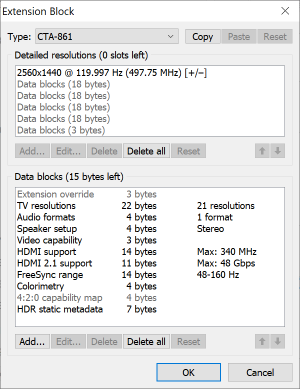 (09-21-2024 03:53 AM)ikonomov Wrote: All my testing has been with DSC disabled which the monitor allows me to do in the OSD. HDMI 2.1 max FRL rate shows as 48 Gbps. After adding 4k/160Hz in a DisplayID 1.3 extension block (with CVT-RB timing) and running restart.exe (same with rebooting the computer) the selectable max refresh rate in NVCP drops from 144Hz to 120Hz, so not only is 160Hz not being added, but the 144Hz is actually being removed. I tried adding 144Hz in the same DisplayID extension block just to test, but it's still not being added and the max shows as 120Hz.Try deleting the extension override data block. 144 Hz will be removed because the hidden extension block is not included, but you should be able to add 144 Hz back in. |