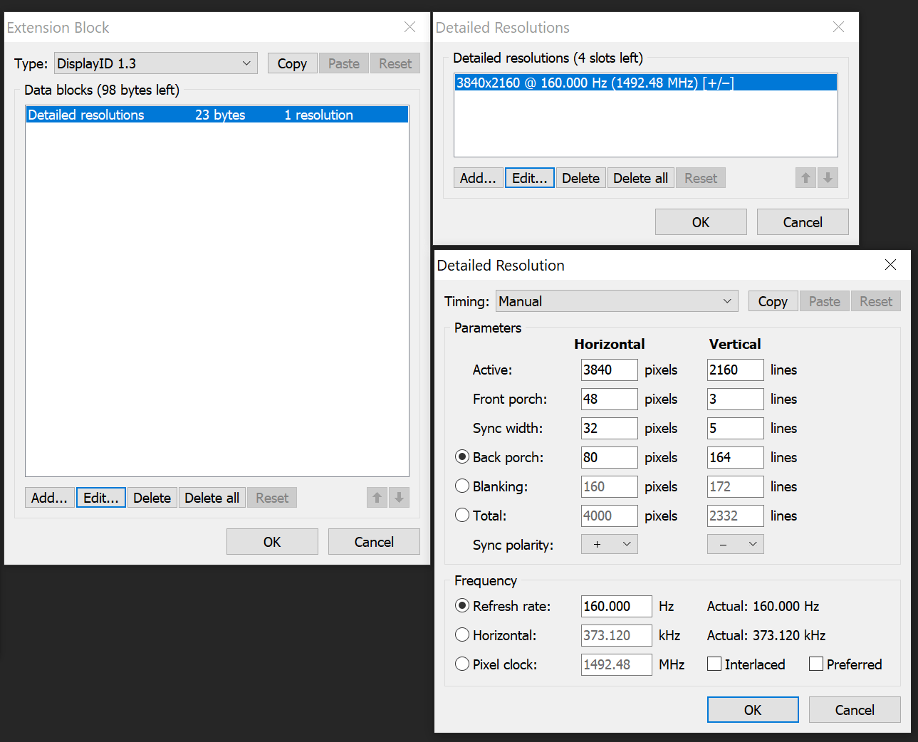 (09-21-2024 02:50 PM)ikonomov Wrote: I've tried both with CVT-RB and CVT-RB2. The problem is that for some reason the newly added 4k 160Hz resolution isn't even being added to NVCP (or display settings in win 10). I was able to add the 144Hz with your suggestion, however, so I wonder why 144Hz was added but not 160Hz. NVCP doesn't allow adding a custom 4k resolution with 160Hz. The test passes but clicking on Save doesn't add the custom resolution to the list. It looks as if something is preventing EDID overrides above 144Hz at 4k or perhaps any resolutions that exceed that frequency at 4k are being ignored. Judging by reviews of other 4k 160Hz monitors it appears that they share the same limitation. For example LG 27GP950-B https://www.rtings.com/monitor/reviews/lg/27gp950-b or Cooler GP27U https://www.rtings.com/monitor/reviews/c...pest-gp27u only support 4k at 144Hz using their 48Gbps HDMI 2.1 connection but can go up to 160Hz using DP 1.4 and DSC. It begs the question where this limitation comes from since 4k/160Hz/8bit using CVT-RB2 timings should be well below 48Gbps. In fact using lower timings even 10bit should be possible.What about refresh rates other than 144 Hz? Try 140 Hz to verify if it's allowing EDID overrides. If that works, try between 144-160 Hz. |