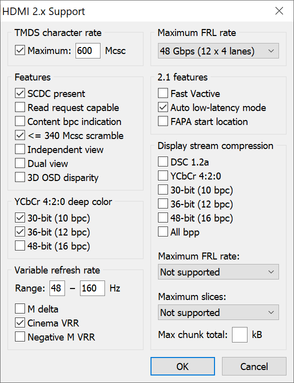 (09-20-2024 09:40 PM)ikonomov Wrote: My monitor (Asus XG27UCG) supports 4k at 160Hz, but it seems only when DSC is enabled even when I connect it to my RTX 3070 using HDMI 2.1 cable (Zeskit X-Tech 6.5ft). The GPU, monitor and cable should all support 48Gbps to allow 4k at 160Hz and 8bit with CVT-RBv2 and even CVT-RB timings without DSC. Nvidia CRU doesn't allow me to add or set any custom resolutions and any attempts using the ToastyX CRU have been unsuccessful. I understand that this can only be done by adding DisplayID extension block. When I disable DSC in the monitor's OSD I don't even understand how I can set the refresh rate to 144Hz over HDMI 2.1 since 120Hz is the highest one listed in the TV resolutions. Does anybody know if it's possible to create a custom resolution of 3840x2160/160Hz/8bit that I can force the monitor to use when DSC is disabled and if so exactly what settings I need to change in the ToastyX CRU to allow me to do this.You can add it in a DisplayID extension block, as you said. 144 Hz might be in a hidden extension block that CRU doesn't support yet, but that doesn't matter since you can add it manually along with 160 Hz. NVIDIA's driver will only allow EDID overrides with DSC disabled, and the monitor might not accept 160 Hz with DSC disabled. Check the FRL rate in the HDMI 2.1 data block and make sure it's 48 Gbps. |