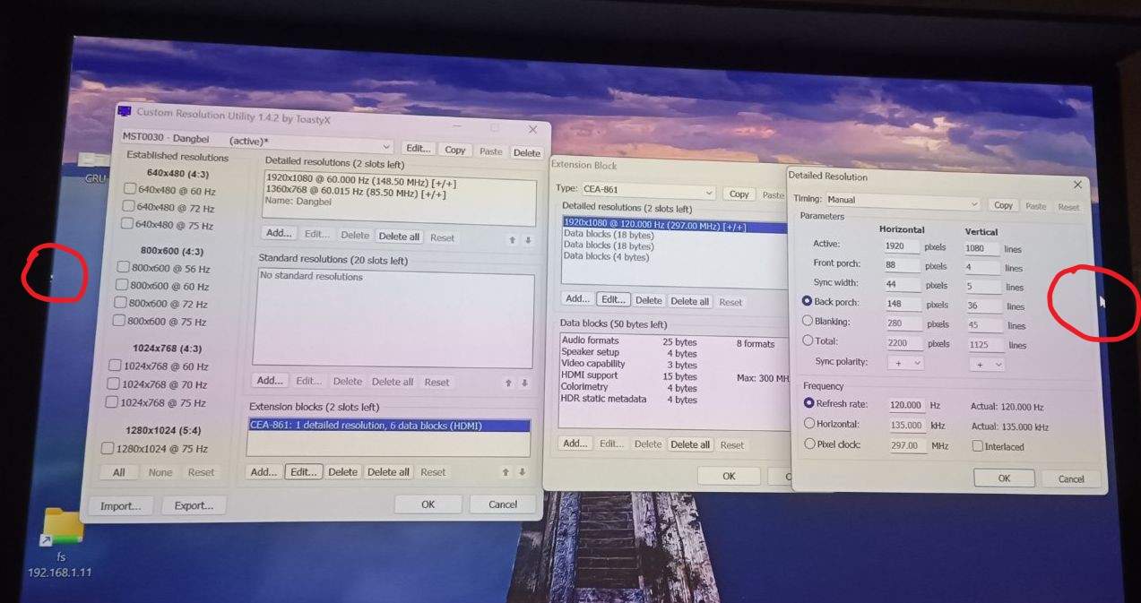 Hello. I have unexpected problem. Im using Dangbei X3 projector, which is fullHD DLP and supports 120hz. When i connected miniPC (Windows 11, intel N100 with intel HD graphics) to it, i could only choose from resolutions with 60hz. Even though projector supports 120hz, there were no resolutions with 120hz to choose from. So i used Custom Resolution Utility and made one 1920x1080 with 120Hz. It's working fine, except for one weird thing - last few rows from right side are visible on the left. As you can see on the photo. I highlighted mouse cursor, right part of it is visible on the left side. When i switch to resolution with 60hz - everything is fine. All the numbers in CRU are default (on the photo), and my 120hz resolution has the same numbers as the default 60hz resolution, except for frequencies. I tried to change the numbers for back porch, front porch and horizontal total back and forth for a small amount, doing restart64 after each iteration, and it didnt change anything at all. Need help! What is causing this and how can i possibly fix that problem?