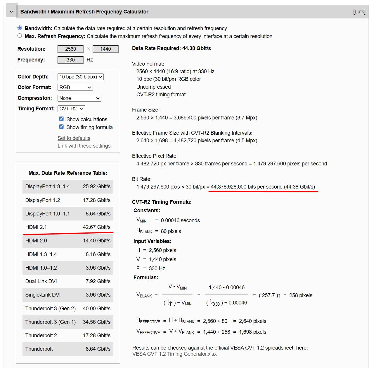 (01-24-2025 03:28 AM)ToastyX Wrote:Thank you for reply.(01-23-2025 10:43 PM)fake42 Wrote: With disabled DSC 2560x1440@330Hz - should not work. But it works! Why?Why should it not work? 48 Gbps has an effective data rate of around 42.6 Gbps, which is enough for around 1420 MHz pixel clock at 10 bpc. I don't know the exact limit since I can't test it, but NVIDIA GPUs are limited to around 1350 MHz anyway, which is still enough for 330 Hz. I used this calculator for bandwidth. It says 2560x1440@330Hz 10bit is 44.38Gbit/s, which is more than HDMI 2.1 42.67Gbit/s Maximum Data Rate. Bad calculator? |