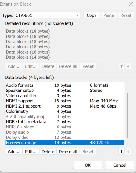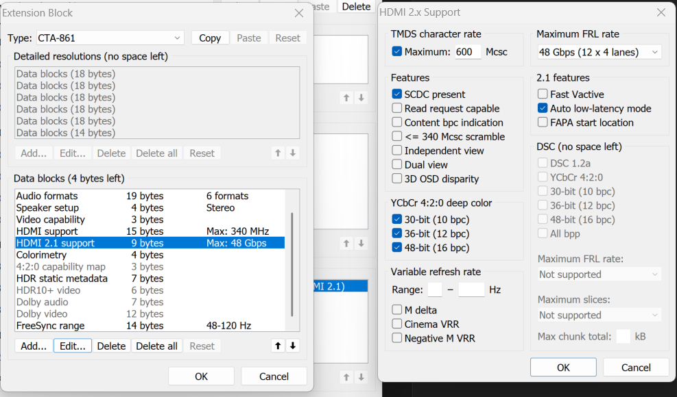 Is it possible to enable VRR on the TCL c845? I've tried adding freesync range into the extension block but didnt work. Also I've tried to set the range in the Variable refresh rate option for the hdmi 2.1 support entry (defaults is blank) but that gives me a black screen and everything breaks. If you guys have any tips how to make this work please tell me!!! There are some prints bellow for the settings!! |