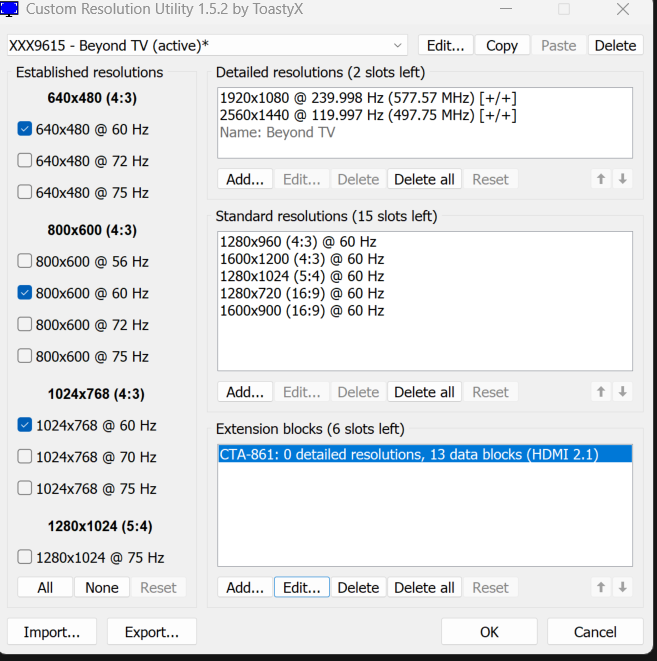 (04-12-2025 09:25 PM)ToastyX Wrote:(04-12-2025 09:07 PM)ildottore101 Wrote: Ok, i edited displayid 1.3 and got blackscreen again. On cta-861 i cant enable it becaus pixelclock turns red.That is supposed to work if the monitor supports the timing. Do you have any other monitors connected? No other Monitors connected. I was able to use these settings in nvidia driver custom resolution successfully but only without DSR. With DSR on, the customres setting in nvidia driver is greyed out/disabled. |