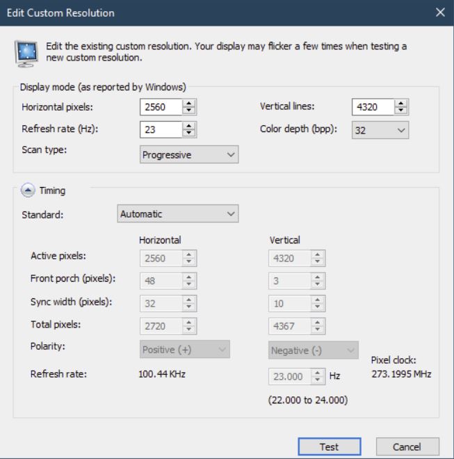 The screen is a 10.1" 8k monochrome LCD from a 3D printer with a HDMI adapter board. Unfortunately the HDMI adapter board doesn't include a correct EDID so the screen doesn't 'just work'. The screen is very strange because being monochrome it maps the RGB channels from the HDMI feed to physical pixels, essentially 'stretching' the image by three times in the horizontal dimension. This reduces the bandwidth over the HDMI cable by a factor of three which makes it possible to drive such a high resolution screen over normal HDMI 2.0. I've attached the settings I need to use when making the EDID. When I try to make an EDID in the CRU with these settings it goes red when I try to enter the 4320 pixel horizontal resolution and won't let me continue, even though that is indeed what this screen needs to be. Is this a hard-coded limitation of the utility, or am I able to bypass this limit somehow? |