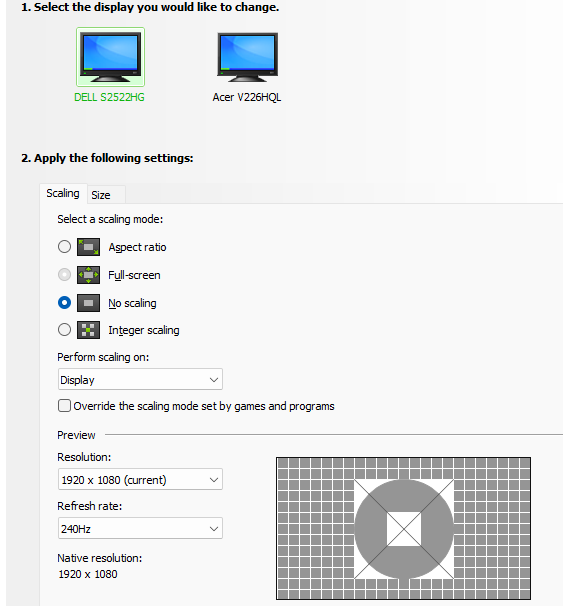 I need help with working the display scaling stuff. I would like to be able to use true stretched res and be able to make my monitor native to an odd res maybe something like 1550. I’ve done this process before on another monitor I've used in the past and I've done everything the exact same. Everything goes perfectly until I want to use the new res I picked out. When I go to nvidia it would normally show that I can’t use both GPU scaling and Display but after I used “restart64.exe” my Display option was gone and got swapped to GPU only. I cant use native res because of this and it does look like my monitor should be able to use CRU because I’m always given the option to choose between Display and GPU until I press “restart64.exe”. I went back and tried this on a different monitor and it worked just fine but it wont work for the one I want. Specs: Monitor- Dell S2522HG GPU- 3070 CPU- Ryzen 5800x (The images below show with and without Display. The image that shows display scaling as an option is before I press “restart64.exe”. The one with GPU is after I press “restart64.exe” and it only locks it at GPU and no longer gives me the option to use Display.) If there is a way to fix this or something I’d love to know. Thank you. |