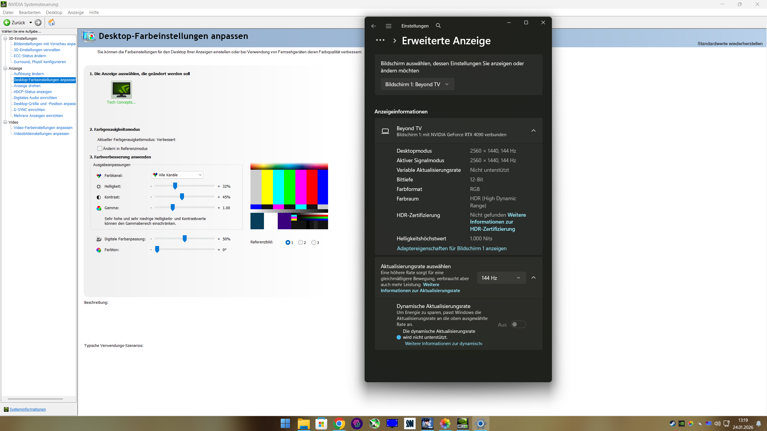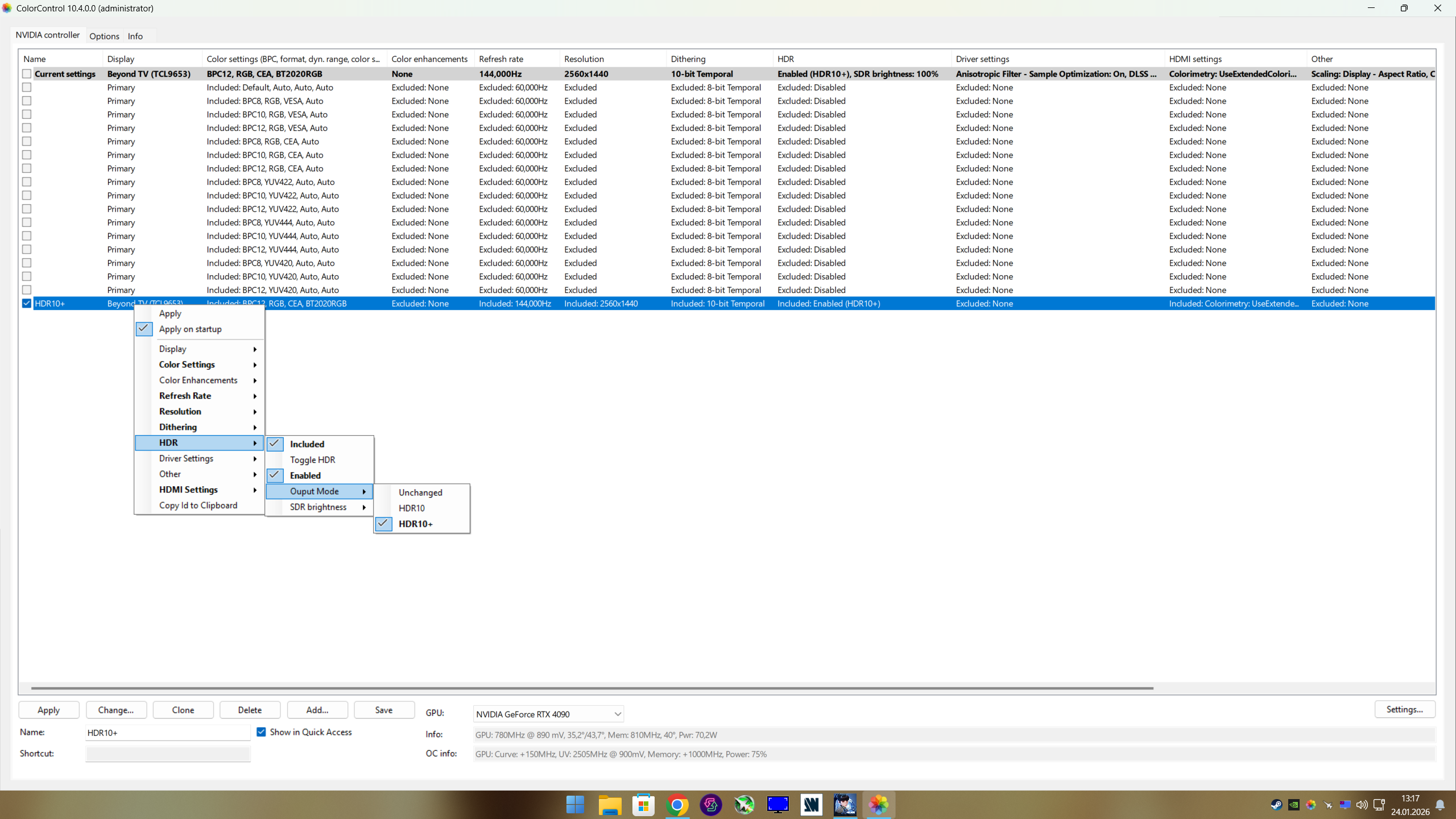 Also i advice with a cheap TV like mine VA Panel without Local Dimming to use HGiG. Mine hits around digital 430 Nits. But this is aweful to look at in games. All colors and brightness lock compressed. So first setup HDR10 or maybe for you HDR10+ but dont use this sh... DTM crap. Then start the windows HDR calibr... tool and start Nvidias control panel or AMDs Driver Panel. Then go to section where you can change brightness and contrast. lower first brighntess till your HDR cali.. tool clip hard at 1000 Nits instead lower original XXX. But in Nvidia dont go lower 30 or it will clip with gamma. for me its brightness 32% and contrast 45%. So peak white hit exact 1000 digital nits in the app. Most games are mastered for 1000 Nits. After that set a color profile, even with ColorControl. Important is that gamma should stay on "Piecewise", this prevents to crush blacks instead hard Gamma 2.2 line. Start games and set in Games to 1000 Nits and enjoy another good experience in HDR even with cheap TV and no fu... DTM BS or compressed 400 Nits HGiG. Believe me i am so happy now. Forgot to mention: HDR10+ works for my TV on PC mode or gaming mode or anything, but only not for VRR Mode! 4k 144 Hz i have a steady stable picture. Only VRR make all ... Here some screenshots, native ist 4k screen, but i set 1440p as prefered with CRU. My TCL has a very good scaling, better than GPU scaling. Text is really sharp. Also my 4090 get a good amount of headroom. |