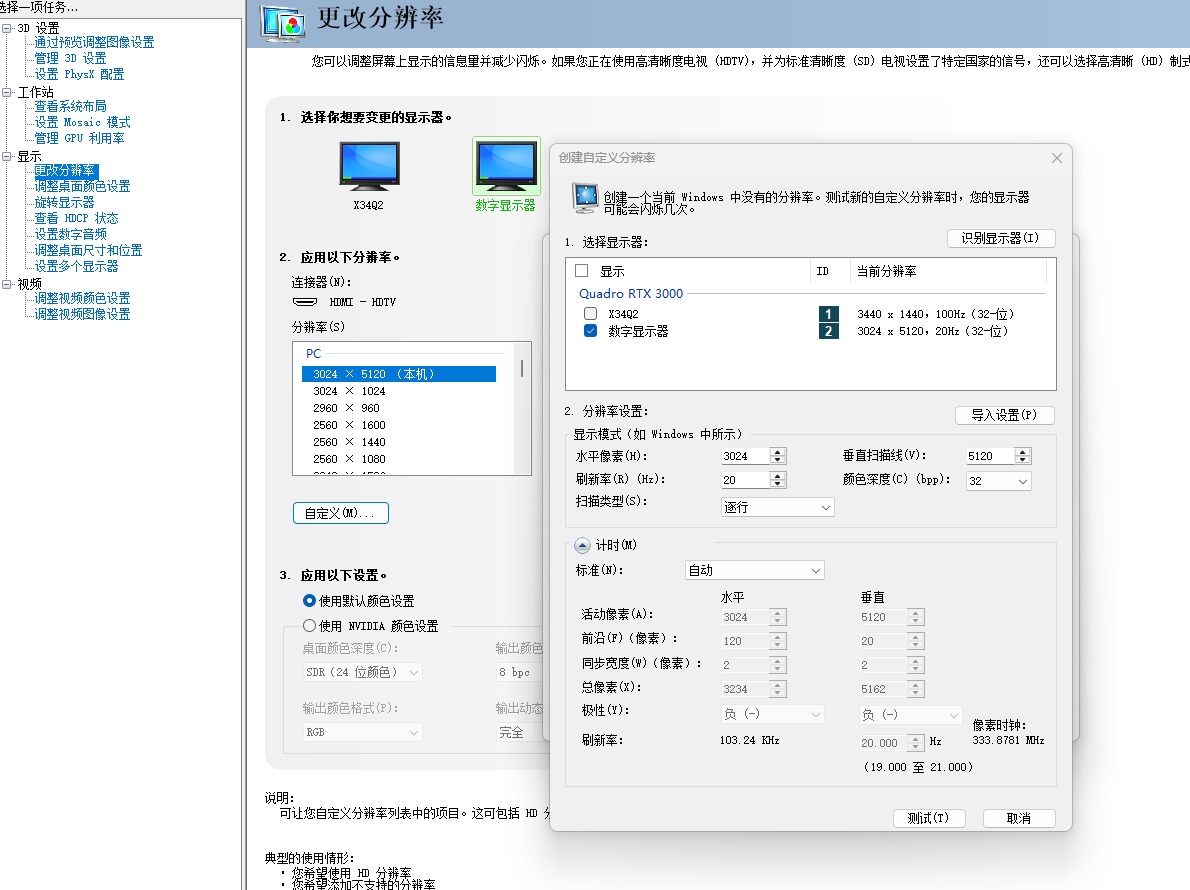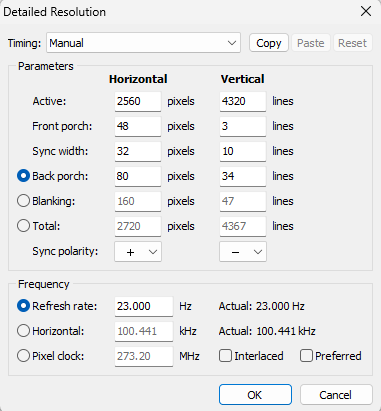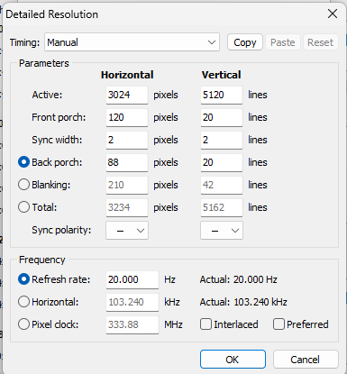 Hi, I'm trying to set up a custom resolution for a 3024x5120 (10k) monochrome transparent lcd - these screens are built for 3dprinters but I'm attempting to use this one in a photographic enlarger. I have some parameters (for rasberry pi setup, in chinese :/) from the manufacturer, and I have managed in the past to get a similar screen working - but I can't seem to make this one work. My machine has APU