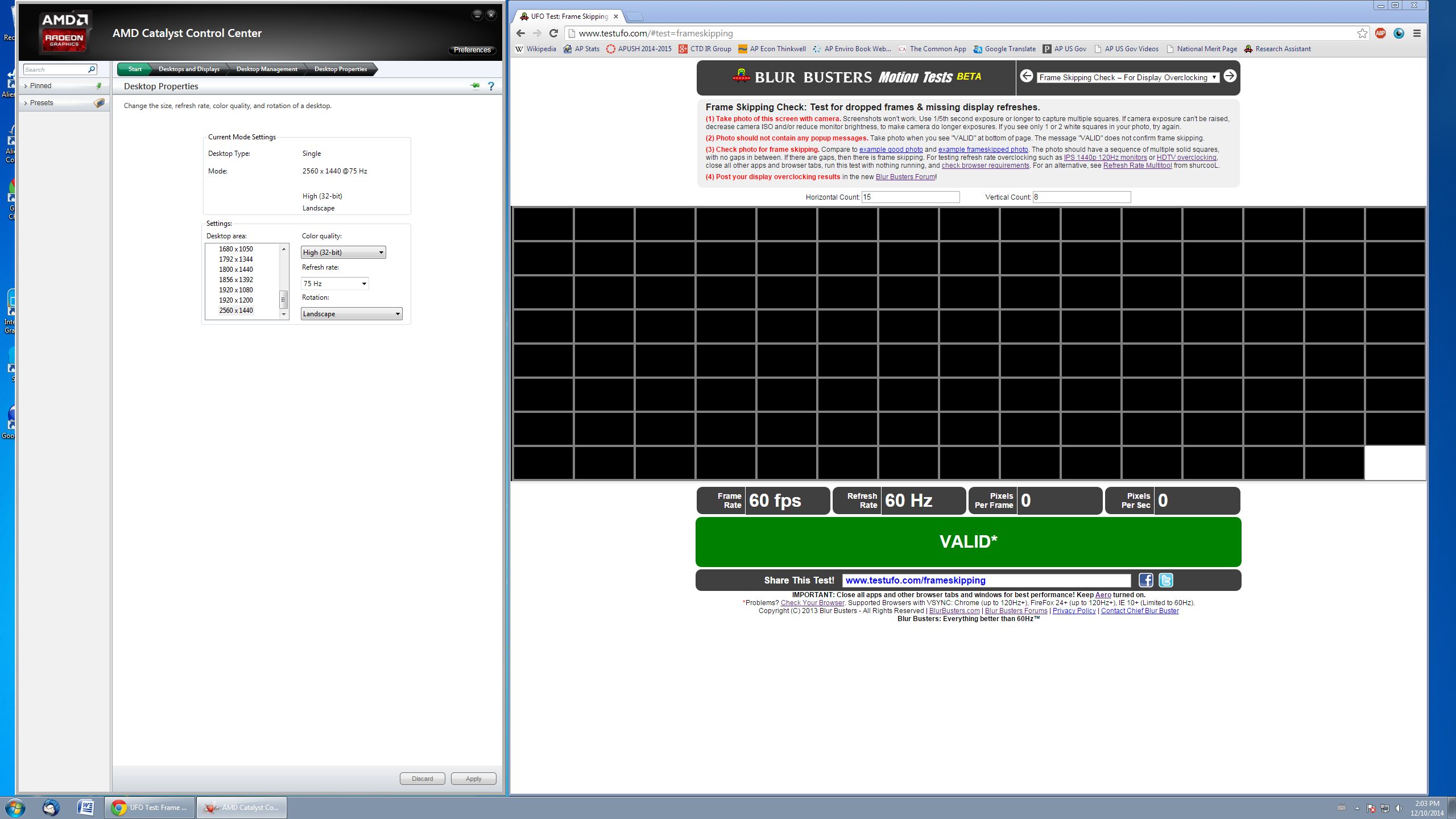 Anyway, I got my new QX320QHD, I plugged it in, great monitor, very nice colors. I connected it with the dual link DVI that came in the box. The whole reason I got it was so I could overclock it, as per the widely circulated screenshot on Amazon here (bottom photo on the left sidebar): https://www.amazon.com/dp/B00KVZMUYI/?tag=mtests-20#ad I actually got the monitor here because lower price, I am 99% sure there's no difference as they are the exact same model: https://www.amazon.com/dp/B00O0UTCPA/?tag=mtests-20#ad I got the monitor, loaded up CRU, added custom resolutions, the first with 85 hz 1440p and the second with 720p 100hz (to see if lowering resolution would allow higher refresh). I also removed the pixel clock that's in the AMD drivers. I rebooted, changed the refresh rate in AMD Catalyst Control... and black screen on 1440p 85hz! I then tried 720p 100hz, and this is what's really strange. It worked. No visible frame skipping, so I loaded up the Test UFO frame skipping [http://www.testufo.com/#test=frameskipping], but it identifies my frame rate & refresh rate as 60hz! I tried a bunch of different resolutions in CRU, including 1440p 65 hz and 720p 65 hz, but every time it still says 60 frame rate and 60 hz refresh. I can provide screenshots tomorrow if necessary. I have a prebuilt with a i7 4790 and R9 270, and my OS is Win 7 Home Prem. Those shouldn't be the issue unless I'm completely off. Thanks so much for the help in advance! I really appreciate it! Edit: screenshot of amd catalyst control saying 75hz while testufo says 60hz. |