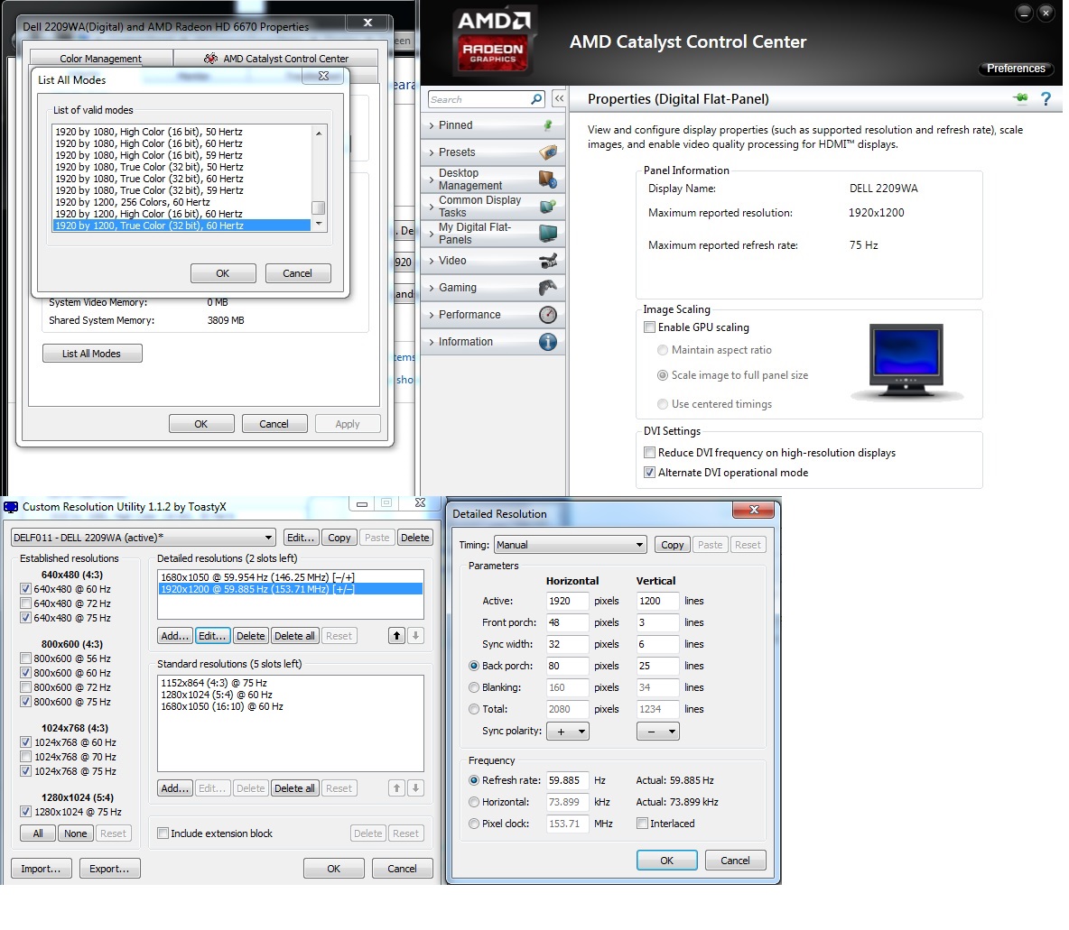 (12-11-2014 05:52 PM)ToastyX Wrote:(12-11-2014 05:04 PM)network4me Wrote: @ToastXThe "LCD standard" option should fill those in for you. The 2209WA will accept both 1920x1200 and 1920x1080, but 1920x1080 will be stretched to the wrong aspect ratio. so in layman terms i dont have to enable gpu scaling (getting it wrong in the first place ) just simple LCD standard ok and reboot. Thanks will post the success news fingers crossed, here goes all or nothing...@ToastyX @ToastyX here is the result, a bit confusing as reported maximum 75hz but in list mode available 60hz , both for 1920 x 1200 which i got thanks to your fantastic tool , so what refresh rate am i in ?beside can i do something about anitaliasing as my screen definitely suffering from it, my catalyst set to app managed about it and sample method set to multisampling , standard 3D settings is balanced,Tessellation amd optimzed , Anisotropic filtering app managed ,any thing do i need to tweak here , i know these questions getting related to a specific card,so my question would be based on your experience do you think i need to enhance the refresh rate ?as from the picture doesnt they look a bit aliased from the previous attachment? Thanks |