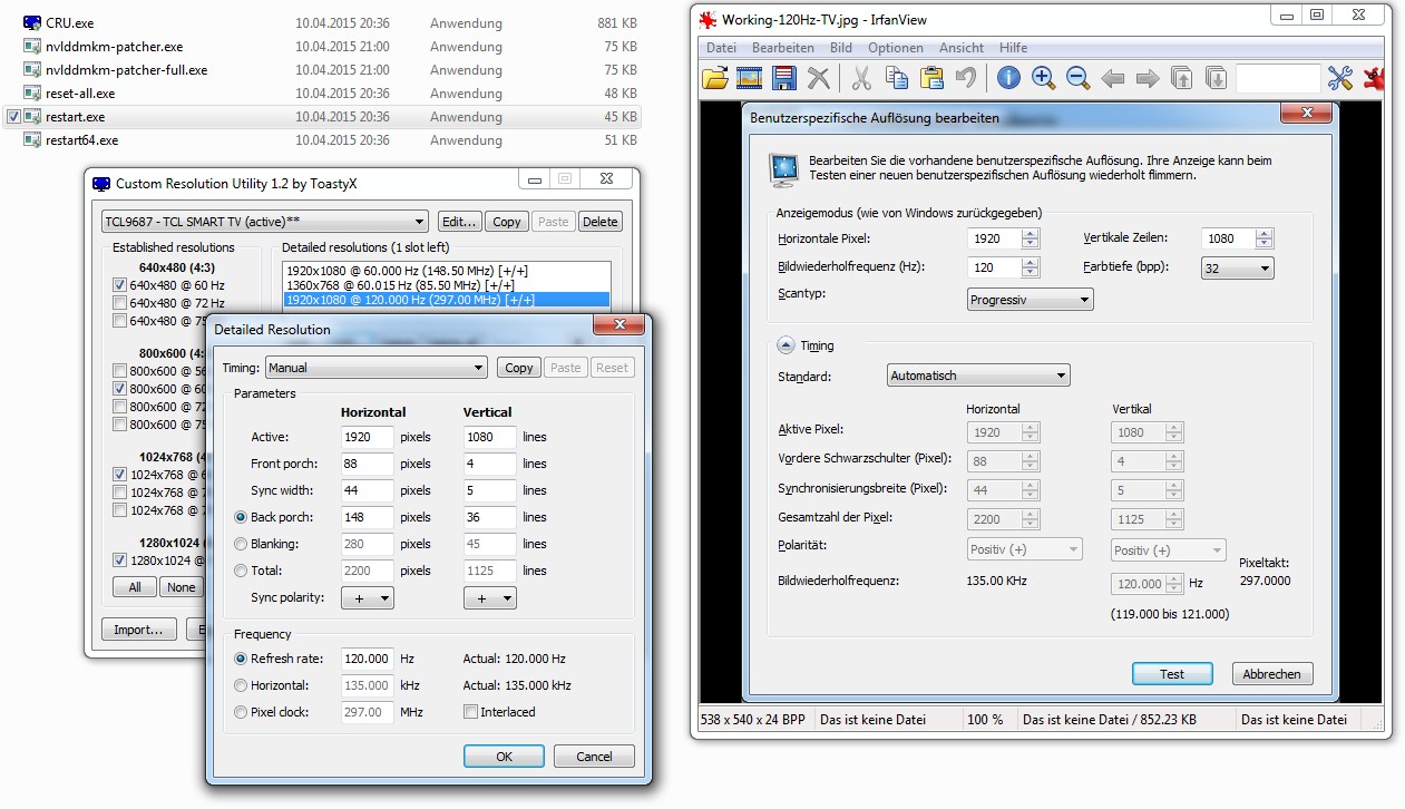 I'd like to post my results and ask for further advice on my TV. So, I do have an GTX 980, 8mm thick quality HDMI High Speed Cable, and TCL U40S7606DS (4k, HDMI2.0). I'd like to achieve 1080p120 (btw. 2160p60 are no problem) - I had "some" success using nVidia custom resolution, but I do have skipped frames (actually the half like it's 60Hz). I am not sure which side tricked me (nVidia as some "feature" to let me believe it sends 120Hz, while it has been just 60 - or the TV that said it run's at 120/121Hz but just displayed the half, anyway), yet I'd like to find out if the TV is capable of it. So what did I test till now you may ask: Using nVidia custom resolution - I did try all the available timings yet the ONLY working configuration was when I tried to set a custom res. out of 1080p60, just set 120 instead of 60Hz and test that. What makes me wonder if really 120Hz are being sent is that it actually uses timing out of 60Hz (when I check while "edit" the saved custom res.). Yet refresh-rates and pixel clock are at double of 60Hz. You can see my working settings for the nVidia custom resolution at the attached jpg file - while you can also see that I tried to set the same values via CRU - and that doesn't work ("No Signal"). In the attached zip-File you can see that the "nVidia (fake?) 120Hz" are actually more like "60Hz" (as just every 2nd frame is displayed). And one weird thing: the TV displays it would be running at 121 Hz. For sure I did also try all the other automatic timings CRU provides - with out success ("No Signal"). All this seems like it can't run at 120Hz, yet I am not about to give up. What I'd like to know: are there other timings I should test (common timings that are known to work) or is there any "overclock-procedure" about which value I should increase in a step by step - overclock test? EDIT: Btw. i forgot to say that 720p@120Hz is working (whatever way i try - using nVidia or CRU). I just did some test as I thought "why not testing other frequencies?" Well (just testing "Standard resolution"), 85Hz did result in "No Signal" but 75Hz was accepted but - see yourself in the attached 75Hz Image - skipped frames. -.- Yet I don't know if it's nVidia or the TV but it's likely the last one (or could nVidia send 60 frames but trick the TV to think it would be 75?) |