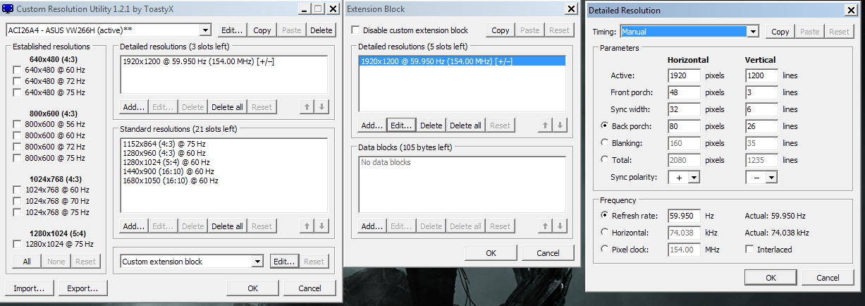 I have one issue... my main monitor will not work with Nvidia Surround, though the left and right secondary screens work perfectly. Here's the details: I have an Acer XB270HU 27" G-Sync display and tring to get tri-monitor Nvidia surround working with an Asus VW266H and a VK266H. Seeing as the 2x Asus monitors are 1920x1200@60hz, I have set the XB270HU to those dimensions and refresh rate. I have set all the monitors to the exact same settings in CRU. Each and every time I click 'Enable Surround', the screens flicker for a few seconds and the 2x Asus start working in Surround, but the center XB270HU just goes black with no response. I have also tried dropping the refresh rate to 59.950 across all 3 in an attempt to get it working without success. It would seem that without setting everything correctly you would not even get the option to click "Enable Surround", I just have no idea how I could get to this stage and have the Acer shut down. FYI it is a 27" G-Sync monitor 144hz 2560x1440 native res display. The other 2 screens are older models. Here are snapshots of the CRU settings for all 3 monitors: (I was messing with the Sync polarity [+] and [-] while testing so that's why the Acer snapshot is different in these pics. It still doesn't work no matter what I set). Any clues you can think of? Thanks! |