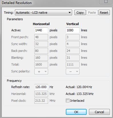 (11-27-2015 05:33 PM)drom Wrote: Hello, I think LCD native is for 60hz. Try to use LCD Standard for 120hz. You're using wrong timings for 1440x1080 and most likely the scaler isn't accepting it. Pretty sure the Hor total should be 1600 and vertical total should be 1144. Front porch 48, 3 sync width 32, 4 HT: 1600 VT: 1144 Pixel clock: 219.65 If that works, you may be able to lower the Vertical total, if you want a 1:1 aspect setting instead of full screen ; You can set the vertical total to 1125 if you want to allow the monitor OSD to select "dot to dot" (1:1) or "aspect for 1440x1080. |