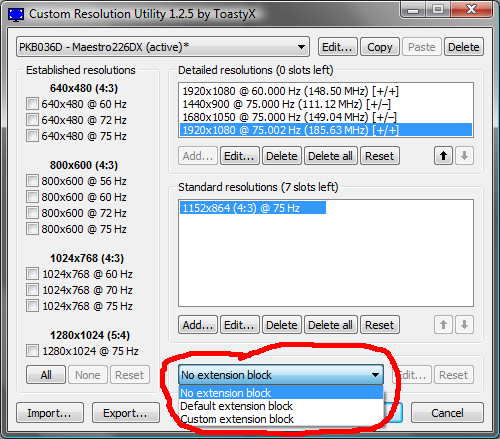(12-09-2015 08:14 PM)sanmal Wrote: I have 75Hz with this program, but i am not understand what exactly need choise inUse whatever timing works. NVIDIA requires a custom extension block. You don't have to put anything in it. |