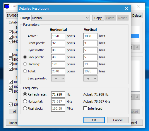 (01-28-2016 04:32 PM)Dalle Wrote: I've managed to add a custom resolution to my Samsung PS64E8005, 71.928Hz with bitstream enabled.TVs usually want the "LCD native" timing parameters. The audio is transmitted during the blanking periods, so I don't expect "LCD reduced" to work properly with audio. |