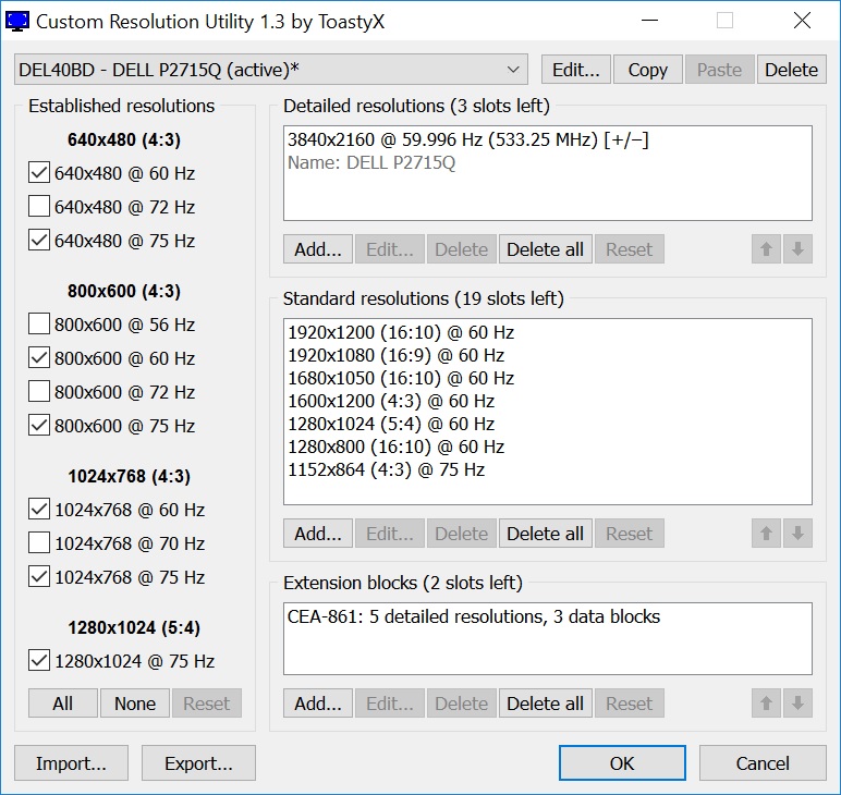 First off, thank you for all the time it took to develop this utility and for the continued support for several years helping others solve problems. Reading through these forums, it is incredible to see the amount of effort you put in to help others. It is my hope that you can help me as well. Background: Graphics Card: XFX Radeon 6870 Monitor: Dell P2715Q Display connection: MiniDP OS: Windows 10 Driver: 15.201.1151.1008 I recently purchased the Dell monitor with hopes of running 4k at 60hz. I know this is likely pushing it for the capabilities of my video card, but I have heard that some people can at least get it to run at 45Hz with CRU and the pixel clock patcher ( http://www.hardwareheaven.com/community/...ys.226759/ ). I've already run the pixel clock patcher (thank you again for that utility) and it worked effortlessly. Where I'm struggling is to get custom resolutions to appear as an option in Windows 10. I have read through many pages of this post (though, admittedly, not all 259 of them) and I think my problem is largely just due to not understanding what I'm doing with CRU. Below is a screen shot from CRU. After I click 'OK' and run the restart utility (I've used both 'restart.exe' and 'restart64.exe') my display driver successfully restarts but I do not seem to be able to get anything other than a 3840x2160 @ 30Hz to be able to appear. I've tried to add 3840x2160 @ 60Hz to the standard resolutions box and I get the red text telling me that it's not supported. I feel rather sure this is an operator error, but hopefully you'll be able to point out what I'm doing wrong. Thank you! Dustin |