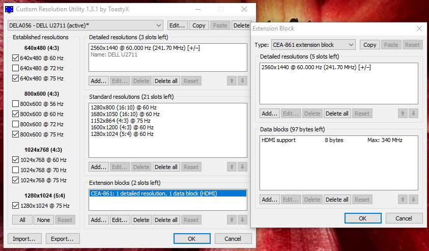 (10-03-2017 02:47 AM)Varinn Wrote: Great utility, got my games running at 1080p 120hz on a Sony X900E display over HDMI.Some games use the desktop refresh rate, and the graphics driver will automatically propagate the refresh rate for the native resolution down to lower resolutions as scaled resolutions. Try 1920x1080 @ 120 Hz as the first detailed resolution and 3840x2160 @ 60 Hz as the second detailed resolution. Then delete all the other resolutions. All you need in the extension block is HDMI support, HDMI 2.0 support (or 4:2:0 resolutions if using HDMI 1.4), and audio formats if you want audio sent to the TV. Make sure to delete any resolutions in the HDMI support data block as well because that's where 30/24 Hz tends to be. |