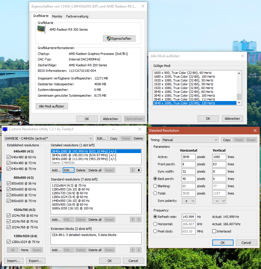 Are there any known issues with Windows 10 and 144hz? my Samsung C49HG90 Monitor should be able to run 144hz, but i only see 120hz in the settings. Opening CRU i can see the 144hz setting is there. Trying to add a 140hz does NOT work, but adding a 111hz did work and showed up. I am using a DP1.2 Cable and i've tried another Cable, same issue. Anyone knows something? Greetings, Haldi |
