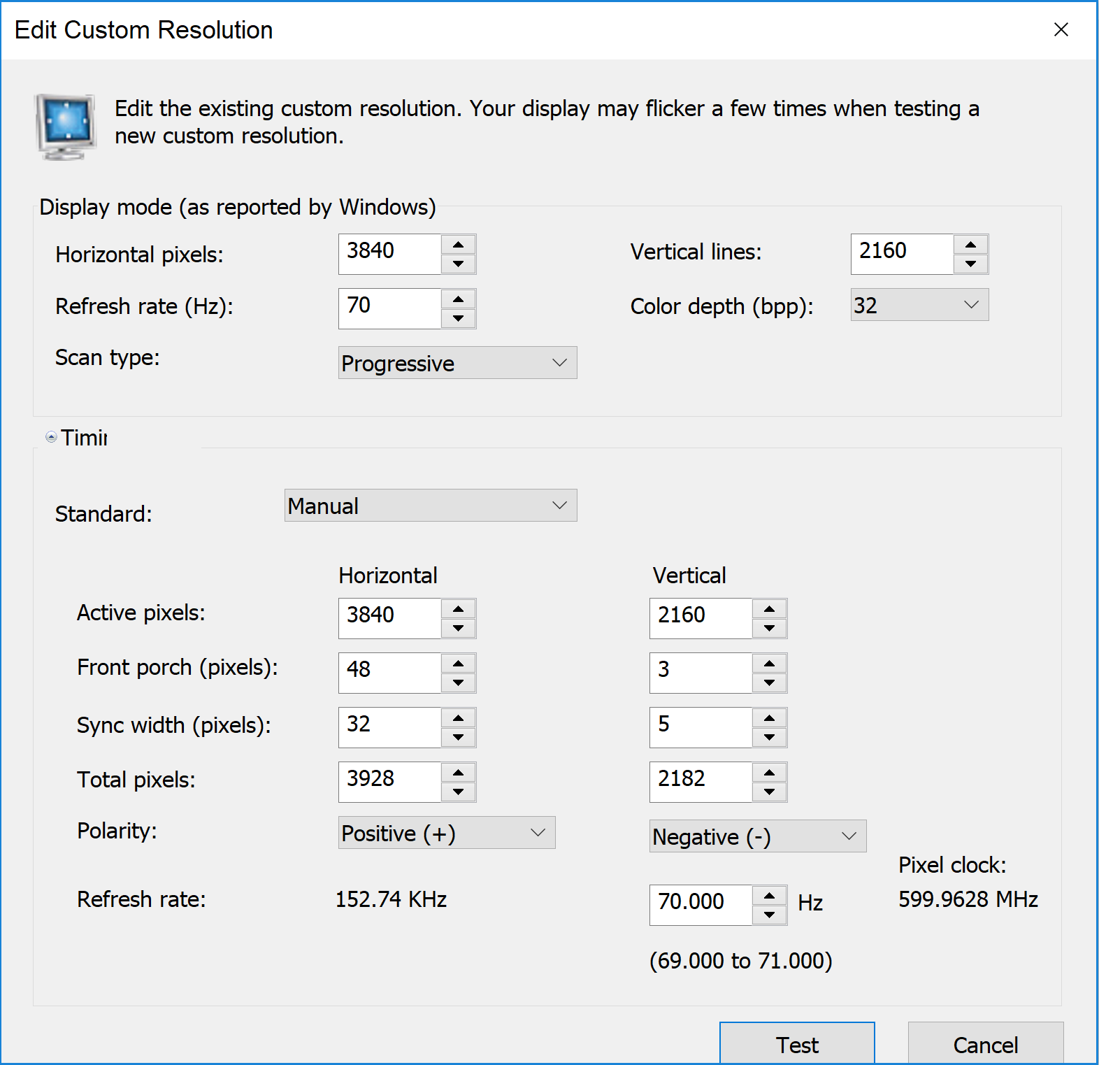 (12-05-2017 03:27 PM)ToastyX Wrote:Thanks for the reply!(12-05-2017 12:45 PM)Azazel Wrote: Is there no way to add a TV resolution data block for 4k@120hz chroma 4:2:0?There is currently no code for 4K @ 120 Hz. Do you know if it will ever be possible to specifically choose chroma resolution? I was thinking of tricking the display by getting ride of all RGB, 4:4:4 and 4:2:2 values so it has no choice but to use 4:2:0 with the specified resolution and refresh rate. I don't think it will work though, so I've opted to try and at least get 4k@72hz to work, "which does fit within the 600.00MHz constraint", but all I've managed to get working is 4k@70hz RGB, verified through UFO Test. I've uploaded different values that seem to work ok. Any idea's on how to tweak them? |