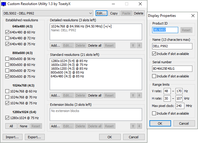 (02-03-2018 02:00 PM)ToastyX Wrote: I need to know the exact limits you're hitting to figure out what's going on, and I need the EDID for the Dell as well. Common DisplayPort limits are 300/400 MHz, 360/480 MHz, and 600 MHz. Ok, I tested some more and found that the issue is that there is some arbitrary pixel clock limit set by the driver, and it is based off the EDID it's reading from displayport in some way. I tested by moving in 1Hz increments in vertical sync at various resolutions. I found that the Dell P992 is being limited at ~330mHz, the LaCie is being limited to ~530mHz, and the 4k dummy plug, ironically, has the lowest limit at 280mHz. Notice that in the EDID's, the Dell is labeled as 240mhz max, the LaCie at 420mHz max, and the 4k dummy has no entry. So it's hard to glean any sort of algorithm AMD might be applying here. Those values might have nothing to do with it. Dell EDID is posted below. |