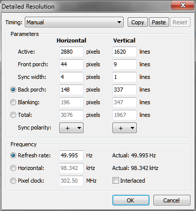 I am having trouble doing this, seems that whatever I do, I'm still stuck on the default refresh rate. It's a laptop screen, not a separate monitor. Computer model: Dell Inspiron 15 7559 OS: Windows 10 Using Intel video, Windows called the monitor "Generic Pnp Monitor" The default timing I'm seeing is this: 1920x1080 front porch: 48px, 3 lines sync width: 32px, 6 lines back porch: 142px, 11 lines Refresh rate: 60.011Hz Pixel clock: 141.40 MHz If I change only the Refresh Rate, it becomes 60.101Hz actual, and the pixel clock becomes 141.61Mhz. If I add one pixel to the back porch (142 =>143), it says it would do 60.098Hz at 141.67 MHz. But when I actually hit OK, then run restart64, then measure the actual framerate, it's still at around 60Hz rather than near 60.1Hz. Edit: vsynctester.com reports 60.098Hz, but when I run a fullscreen OpenGL program that measures my framerate, I see a value oscillating between 59.999 and 60.002 Hz. edit: When I query DXGI video modes, I don't see the custom refresh rate in there. final edit: Rebooting the computer fixes everything. All the custom refresh rates work fine afterwards, I just can't have one custom refresh rate too close to another one. One ends up covering up the other if I have both 60.011 and 60.098 at the same time. |