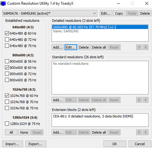 I'm new here, and have been trying to fix something for a few months, had a break and focused on a few other things, but am back on this stuff again, and would really like to try and sort it out asap. So I dived deep into CRU in the last day or two and frustratingly got half way to thinking I'd done it.. but had no luck so am looking for some advice, from anyone who may be able to help. I'll try to type it out as simple as possible.. hopefully this isn't too much of a complicated one. Apologies if it's long. I'm trying to juggle two seperate issues and fix them one way or the other. I have a Samsung 27 inch monitor.. S27C750 with native refresh rates of 50, 59 and 60hz @ 1920x1080 through HMDI connection.. into an NVIDIA GTX 780 Ti. My main concern is video playback in terms of lots of different video types and formats and lots of different frame rates.. 23.976, 25, 29.970, 30, 50, 59.994 etc. I've been doing a lot of video editting in the last few months and would prefer to have the refresh rate of the monitor locked into multiples of these frame rates for smoothest playback and syncing of frames. I've pretty much done that ok with most video types, except for the Blu Ray files that are 23.976. My temporary solution of using a custom refresh rate/resolution of 48hz in NVIDIA Control Panel half worked.. but introduced a new problem, which I've had problems fixing all year, and still haven't found a solution. I tried editting the EDID of the monitor itself, making a custom monitor inf file, and even the simpler solution of building a custom resolution within NVIDIA Control Panel and so far haven't had any luck, and so far haven't been able to sync up those 23.976 videos properly. The monitor doesn't support 48hz natively, but when using it in NVIDIA Control Panel as a custom resolution it works flawlessy, except for one frustrating problem. The RGB range is set to limited, and even if I change it to 'full' 0-255 within the drivers, it says that it has changed it onscreen but onscreen nothing changes.. and the colours stay washed out and pale and look really bad. Not just in videos but in the desktop, browser, etc. Initially I assumed it was a monitor hardware problem in that it could support that resolution (unofficially) but that because it's outside of it's stated frequency range it would create this colour problem, but upon further testing in the last few days, it's become clear that it's actually an NVIDIA driver issue. Because.. when I create other custom resolutions that use a refresh rate within the official range of 50-60hz.. the same issue occurs. So 54hz, or 58hz creates the same washed out colours problem. I live in PAL territory so my default refresh rate in windows is 50hz for HDTV content or 25fps PAL DVD's, and then my video player temporarily changes the refresh to 60hz when watching YT videos or NTSC content of 30fps. Everything works well except for film which is 23.976 introducing the 'judder' during panned shots, and my aim so for proper syncing for all video content that I encounter. To conclude on that.. the only way I'm able to get full range 0-255 colour with my NVIDIA card and drivers (which looks great, both in windows and in video playback) is to use the 'native' resolutions with refresh rates of 50, 59 or 60. So my mission has been to get NVIDIA drivers to recognise 48hz as a native resolution. I got sooo close.. but frustratingly fell short with CRU at the final step. I'd be appreciative of any help you can offer in terms of overcoming this final step. I took some hours to experiment and familiarise myself with the CRU program and it's options. I was able to nail down the options I am looking for in the 'Extension Blocks' section of CRU, in the CEA-861 section.. and in the 'TV resolutions' section.. by playing around with those, I was able to create my own NVIDIA 'native resolutions', or remove them, for example having it so that NVIDIA would only show 60hz as the only native resolution, or 50hz etc. So that was some progress. ![]() Everything else I tried either yielded no results at all, or undesirable results. For example, in the VTB-EXT and DisplayID sections, the changes did go through but it changed the recognition of those resolutions to DVI.. despite using HDMI cable.. and ALL resolutions became washed out and pale.. and I lost full range colour for all of them. Showing once again, that my 48hz pale colour problem, is a NVIDIA driver issue, not a hardware issue.. as I now had this same colour for every resolution on the list, even the native ones. So far the only way I've been able to maintain the full range colour that I desire is to use HDMI 'TV Resolutions' that are recognised as 'native' by the NVIDIA drivers. Everything else messes the colour up. The frustrating part is that 48hz is the only change within all the resolution options that doesn't work. The tick box for native resolution is greyed out, despite being ok with my monitor (unofficially), where as 24 or 25, or 100hz is able to be ticked. And I even switched to this mode (25hz) without my monitor supporting it and then had the monitor go black and say that it isn't supported. And have to revert back. The tick box is available to tick for all of the others, and NVIDIA Control Panel will recognise these extra modes which is exactly what I've been looking for.. EXCEPT the one mode that I really want.. 48hz is unavailable as a native resolution. ![]() ![]() As you can see the 25hz option is bolded, and even though I haven't done so in the screenshot, I could do the same for 24, 100, or 120hz.. but for some reason not 48hz, even though this is the mode that my monitor would actually be able to handle. I have no way of 100% confirming it, but I am hoping that by having this option available in the NVIDIA Control Panel in the native resolution section, under HDMI.. that it would give me the full range colour that I've been looking for. In the same way that it does for 50, 59 or 60hz. ![]() The 25