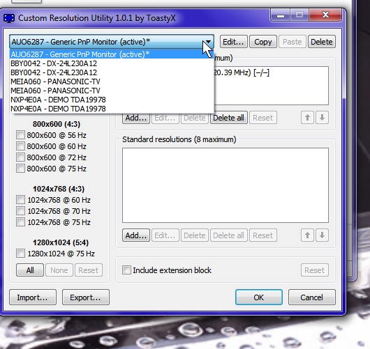 (08-24-2013 09:02 PM)ToastyX Wrote: That could be interfering with your ability to use detailed resolutions. Uninstall the monitor using the device manager. Then scan for hardware changes. The monitor should be listed as Generic PnP Monitor or Generic Non-PnP Monitor. Then use CRU to add the resolutions again. If the monitor is Non-PnP, download CRU 1.0.1 to edit it.Did this, was recognised as Generic PnP Monitor, rebooted, applied CRU settings, rebooted again. Games still not use the Detailed resolution refresh rate. They default to 100Hz (why 100Hz? because of the first entry in the Detailed resolutions?) and GPU still applies scaling (only for the 100Hz, 125Hz and 150Hz it doesn't apply any scaling). (08-24-2013 09:02 PM)ToastyX Wrote: Did you try adding the highest refresh rates as detailed resolutions? I don't see why using detailed resolutions would affect other resolutions.This is how I've setup CRU now, all the resolutions that require 123Hz+ are in Detailed resolution list (except for the first as this defines the default resolution, which is 1600x1200@100Hz my default for desktop) : ![]() (08-24-2013 09:02 PM)ToastyX Wrote: There shouldn't be any refresh rates other than the ones you add.There aren't any other than the ones listed by CRU (including the Established resolutions and their respective refresh rates) edit: When having 1024x768@150Hz in Detailed resolutions and having 1024x768@120Hz in Standard resolutions it will not force 120Hz in games. When having 1024x768@120Hz in Standard resolutions only it does not force 120Hz in games either. So it seems I was wrong in the first place about Standard resolutions forcing refresh rates, sorry about that. I guess 100Hz and 120Hz are enabled for 1024x768 because of the 1600x1200@100Hz first Detailed resolutions entry? And that's why it defaults to 100Hz for those lower resolutions? edit2: I tried removing the 1600x1200@100Hz as first entry, adding it to the Standard resolution list, and having 800x600@160Hz as the first entry in Detailed resolutions now, so the highest refresh rate is listed first. This still does not force refresh rates for the lower resolutions, it keeps defaulting to 100Hz and applying scaling, it seems it keeps my desktop resolution 1600x1200@100Hz and centers the picture when I run a game (where I can't select a refresh rate) at 1024x768. I wonder how to solve this? If at all possible with CRU? edit3: After setting my desktop resolution to 1920x1440@85Hz just for fun, then running a game in 1024x768 it does use 150Hz and no scaling?!?!?!?!? After further testing it seems that when my desktop resolution is using a refresh rate that >= 100Hz, it uses 100Hz and applies scaling, anything < 100Hz it will use the refresh rate as listed in CRU and does not apply scaling. After testing the above while I re-added 1600x1200@100Hz as the first entry in Detailed resolutions it always uses 100Hz and applies scaling when launching a game in 1024x768... Is this really a driver bug then? I'm lost now ![]() edit4: This seems to be the cause for my scaling problem: (08-24-2013 09:02 PM)ToastyX Wrote: Usually GPU scaling will apply to any resolution that's not listed in the EDID regardless of that setting.My question on this regard: is there a way around this? ![]() Or I just have to find a way to force any resolution to always use its maximum refresh rate. |