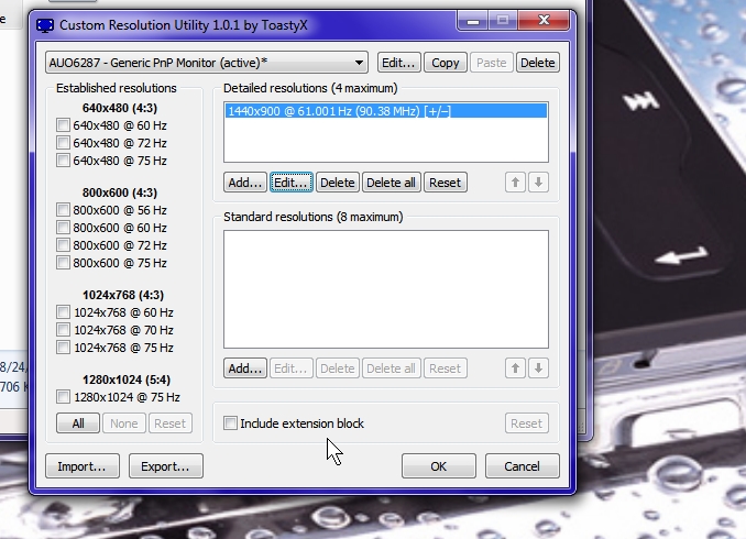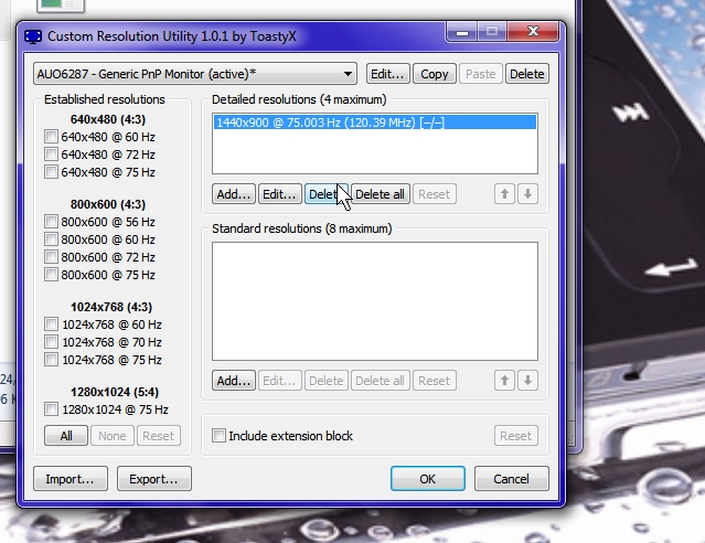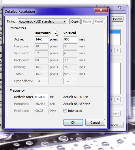 Thx! for this Handy tool! <3I have a problem! I have an Mobility ATI RADEON 5850 1Gb I "can" go higher than 2560x1600 But when i do it whit 2880x1620 i can see some weird noisy lines around icons and window Can that be something whit BLANKING or Back Porch here is a screen whit the settings i use whit 2560x1600 and it works fine! and also a info link about my monitor! I just want to get 2880x1620 with no noisy lines like around icons and so on! [Image: http://i.minus.com/jbl0NWpzxhfWPK.jpg] Here is a Manual PDF for my monitor! so you maybe can help me out better whit my problem! us.aoc.com/monitor_displays/e2343fi http://www.mediafire.com/?2r0d1u71r53av43 |