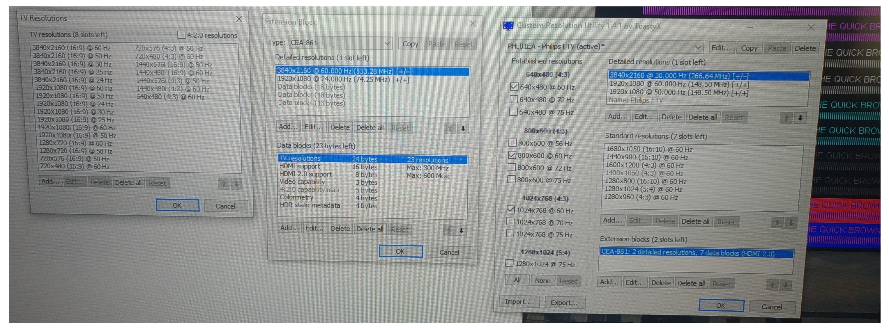 I hope to enrich this great forum with a case I haven't found a response to anywhere else. I'm trying to achieve a UHD 3840x2160 resolution at 60Hz with RGB Chroma 4:4:4 on the following setup: - HP Pavilion Gaming Laptop (15-CX0012nl) with HDMI 2.0 output from Nvidia GTX 1050 Ti - HDMI 2.0 cable - UHD TV Philips 43PUS6503/12 with 4K60 4:4:4 mode activated on the HDMI input in use The problem is on the 4:4:4 side: altough the RGB or YCbCr444 color selected on the Nvidia control panel, the Chroma 4:4:4 test is failed. Thanks to the excellent CRU software, after some tweaks, for a brief moment of glory I've been able to obtain a crystal clear 4:4:4. Too bad, after turning off and on the TV (PC still on and nothing changed in CRU) the 4:4:4 disappeared. After several hours of failed attempts I'm still not capable of setting it up again. Immediately after obtaining 4:4:4, I exported the CRU settings (attached) and I took pictures of the main windows (attached too). Suggestions about the issue would be greatly appreciated. Thanks in advance! |
