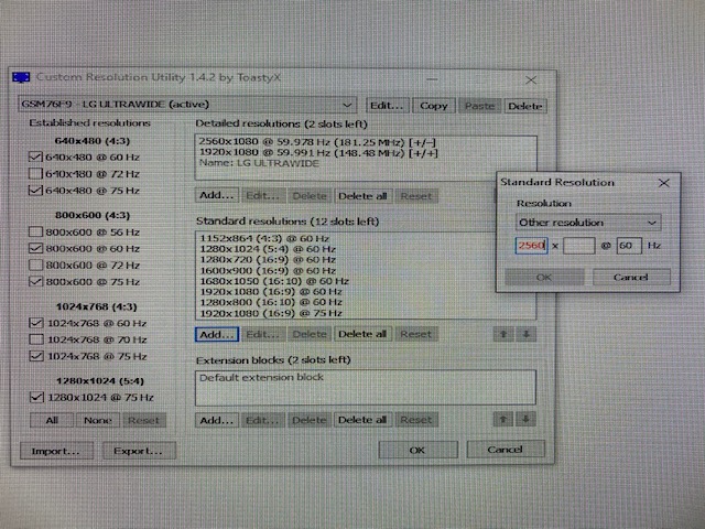 Hello, everyone. I'm having a hard time trying to set the native display resolution of a lg29um68 monitor, which is 2560x1080, in Windows 10, using CRU. The maximum resolution I could set until now was 1920x1080.