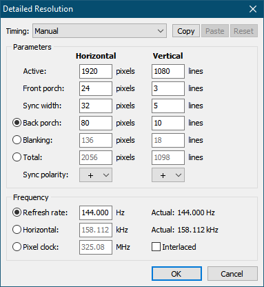 (02-14-2020 08:32 PM)benoe Wrote: I cannot find the fullhd 120Hz settings to edit (to make 120Hz work with hdmi as well) Detailed resolutions list only 60 and 144hz modes.HDMI and DisplayPort connections have different EDIDs. Are you looking at the DisplayPort EDID or the HDMI EDID (they might have different product IDs)? CRU only shows 3 extension blocks. If the detailed timing was on a fourth then it could be missing (usually 3 is enough so I doubt this is the problem). Double-check the EDIDs in Monitor Asset Manager (moninfo.exe). (02-14-2020 08:32 PM)benoe Wrote: The 144hz resolution has 325Mhz pixel clock, standard sets this to 346.55Mhz. Is it possible that this monitor cannot go this high, and that's why I cannot set the standard setting? Or should I try with better cables maybe?The display is not using a standard timing because it won't fit in the allowed range 330 MHz max (CRU should probably rename the timings to GTF, CVT, CVT-RB, CVT-RB2 so we know what standard is being used - 1920x1080 144Hz 346 MHz is CVT-RB). If the EDID comes with a 144 Hz timing using 325 MHz, then why are you creating another timing using 346 MHz? |