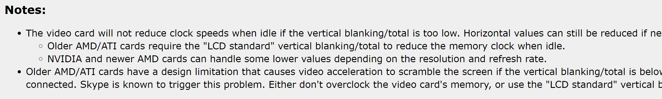 (03-21-2020 04:49 AM)qqq Wrote: hello ToastyX ,I use AMD RX5700 and find a very tricky problem when I connect two monitors (2560*1440@60Hz HDMI,3840*2160@60Hz DP).The memory(VRAM) clock will stuck at full speed(1750MHz) thus temperature will increase a lot when idle.This is really annoying.Many people also suffer from this problem for a long time with other AMD card when use 144Hz or more than one monitors.AMD official said they won't fix this in drivers because they don't think it is a problem.That's normal when using multiple monitors with different resolutions. The memory clock can only change during the blanking period to avoid screen flickering, but if you have two monitors with different resolutions, the blanking periods won't be synchronized, so there's no way to change the memory clock without at least one screen flickering. The note about vertical blanking/total is a separate issue. If the vertical blanking/total is too low, there won't be enough time to change the memory clock without screen flickering. |