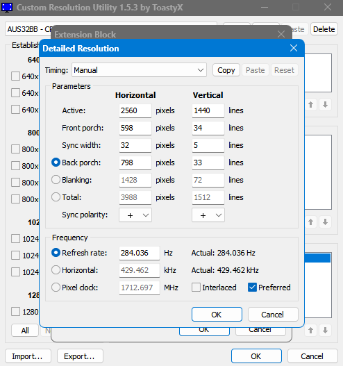 (06-13-2025 03:01 PM)ToastyX Wrote: Yes, I saw all the pics. This isn't frame skipping. Frame skipping would have gaps with fully black squares. The browser is tearing as if vsync were disabled for some reason. Try the test with Chrome. thank you for pointing me in the right direction, chrome gave even worse result, but when you mentioned vsync i went to radeon settings and.... problem solved ? see screenshot at the bottom of the link i have few more questions 1. would you change anything in my CRU settings ? those are ABSOLUTE minimal working/stable settings 2. before this monitor i had AOC AG322QC4 - 144Hz and it had some horizontal lines that where mostly pronounced on blue elements in apps, website buttons, and blue windows title bar, scrollbar etc... different GPU and cable tested on this Asus monitor lines are 60% more pronounced than on AOC ![]() From 183.921Mhz to 183.935Mhz lines appear/disappear randomly, anything above .935 lines are permanent and .920 or lower they disappear permanently here are two pictures and video, i spent half a day trying to make few good pics, lines are MUCH more pronounced and visible when looking directly at the screen, the phone camera simply couldn't capture it, also on the video you can see they randomly come and go, mostly noticeable around the word "Utility" that's just on video they show up equally across whole elements https://imgur.com/a/sJNAQKo any idea how to resolve this ? 3. can you please make profiles remember/import custom monitor names ? 4. is there any command line that i can use to make .bat file, for one click auto load profile and restart or if i can export settings from registry and make .reg file thank you for CRU ❤️ EDIT: apparently handshake and thumbs up smilies aren't recognized on the forum |