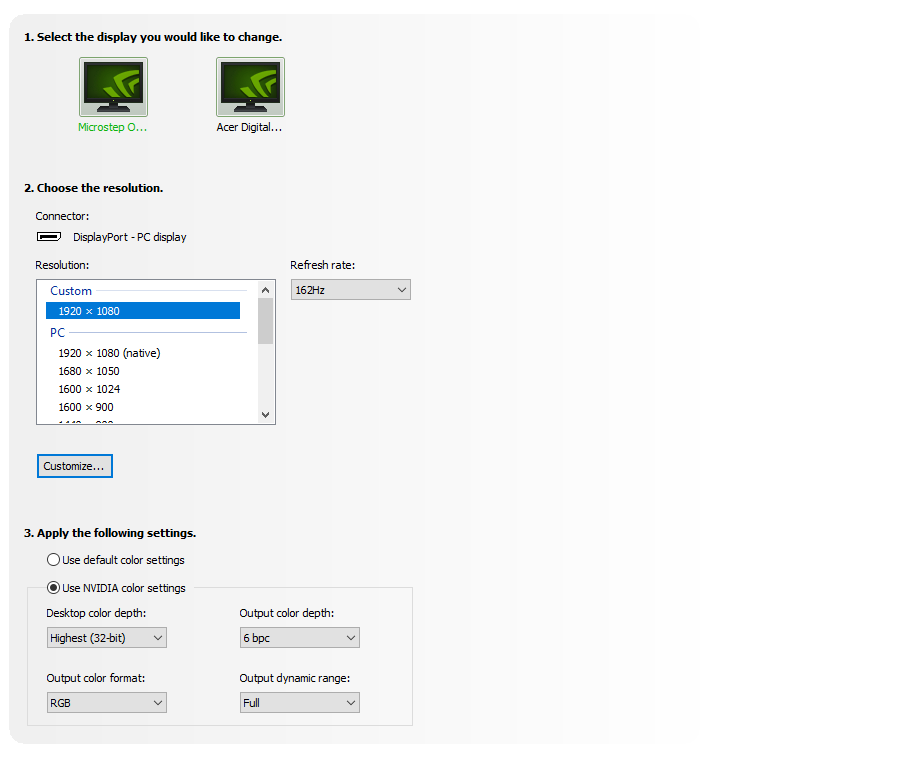 Hello, so I've managed to OC my monitor from 144hz to 162 successfully with no frame skipping and with Gsync stretched with it as well (48-162) at 1080p but I run into issue where the output color is stuck to only YCbCr422 and isn't giving me the option to switch to RGB. I used the exact same timings as Nvidia control panel for the overclock to make sure there wasn't any issues. If you also do it through Nvida control panel it it keeps it RGB but drops the output color depth from 8 to 6 (Same thing for the OC through CRU but with out RGB setting). Im assuming this has some thing to do with the bandwidth or the timings I used considering a forum post in the past...I know my cable isn't the problem since its DP 1.4 and its not my GPU as its a rtx 2070 super. I also tried the presets for the timings and it wont work unless its the reduced preset but even then its buggy sometimes so Im stuck with this. Is there any way to fix this while also maintaining hopefully everything from 144hz? Thanks in advance!